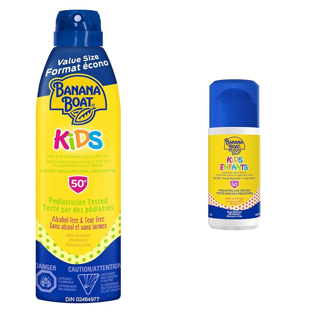 Banana Boat Kids Tear Free Sunscreen Clear Spray, Spf 50 , Broad Spectrum Protection, Value Size, 226G, 226 Grams Banana Boat Kids sunscreen is a pediatrician tested, tear-free formula that's ultra gentle on skin with no added oils or fragrance. For moms searching for that perfect sunscreen that's gentle on skin and provides broad spectrum UVA UVB protection, Banana Boat has the solution. Banana Boat sunscreen stays on in all sorts of conditions so you can enjoy more fun in the sun! Banana Boat Kids Sunscreen Lotion Roll On SPF 50 Banana Boat Kids Roll-On sunscreen is the perfect size to stow in a backpack for on-the-go days. This travel friendly sunscreen is pediatrician tested and won't run into eyes—and the convenient roll-on format means less messy application. This sunscreen ensures water-resistant, broad-spectrum protection that lasts as long as the fun does (reapply as directed).Product 2: WON'T RUN INTO EYES. Product 2: PEDIATRICIAN TESTED - Mild, gentle formula. Product 1: Sun protection: 50 . Product 1: TEAR FREE - Won't run into eyes. Product 1: HYPOALLERGENIC - No added oils or fragrances. Product 1: PEDIATRICIAN TESTED - Gentle formula for delicate skin.