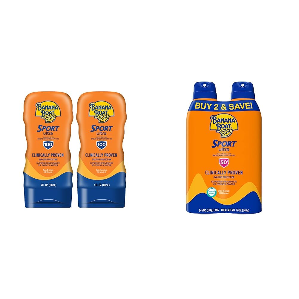 This sunscreen bundle from Banana Boat includes both lotion and spray sport sunscreen options to provide versatile protection for an active lifestyle. The first component is a 4 oz twin pack of Banana Boat Sport Ultra Sunscreen Lotion with SPF 100. This extra-strength lotion provides powerful broad spectrum UVA UVB protection that absorbs quickly into a non-greasy, lightweight formula ideal for sport enthusiasts. It is sweat- and water-resistant for up to 80 minutes. The second component is a 6 oz twin pack of Banana Boat Sport Ultra Sunscreen Spray with SPF 50. This spray-on sunscreen delivers strong broad spectrum protection in a fast-drying, breathable formula designed for active use. It is also sweat- and water-resistant for up to 80 minutes. Both sport sunscreen options in this bundle are oxybenzone and octinoxate free. With one highest-strength lotion and one medium-strength spray sunscreen, this bundle equips you for fun in the sun. The Banana Boat Sport Ultra formulas complement each other with shared performance features like water sweat resistance, lightweight non-greasy feel, and broad spectrum UVA UVB protection. Convenient twin pack sizes ensure you can reapply as needed and share the sun protection.