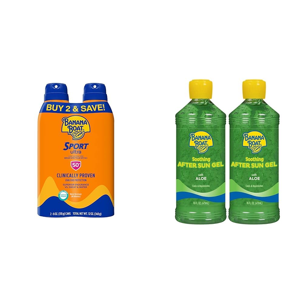 This Banana Boat sun care twin pack contains one 6oz spray bottle of Banana Boat Sport Ultra SPF 50 sunscreen and one 16oz bottle of Banana Boat Soothing Aloe After Sun Gel. The Sport Ultra sunscreen provides strong UVA UVB protection with an SPF 50, water resistant formula designed for active lifestyles. It goes on lightweight, absorbs quickly, and resists sweat for up to 80 minutes. The Soothing Aloe Gel contains aloe and vitamin E to cool, soothe and moisturize skin after sun exposure. Together these complementary products provide complete sun care - protecting skin from burns and damage with the Sport Ultra sunscreen, followed by replenishing moisture and nourishing skin with the Aloe Gel. With broad spectrum SPF 50 shields from UV rays, and fast-absorbing gel to heal and hydrate, this twin pack has everything needed for a day of sun protection and after sun recovery. The oxybenzone-free formulas make this bundle a smart choice for the health-conscious outdoor enthusiast. Whether headed to the beach, pool, field, court or park, this Banana Boat duo helps you make the most of sunny days while caring for your skin.