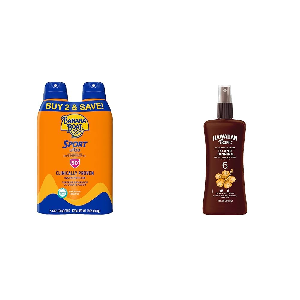 The Banana Boat Sport Ultra Sunscreen Twin Pack and Hawaiian Tropic Island Tanning Oil Spray Sunscreen bundle offers strong sun protection and luxurious tanning and hydration. The Banana Boat twin pack provides two 6oz bottles of fast-absorbing, non-greasy SPF 50 sunscreen spray designed for active lifestyles. Its lightweight formula is sweat- and water-resistant for up to 80 minutes and specially formulated to not run into eyes. With broad spectrum UVA UVB protection, this oxybenzone- and octinoxate-free sunscreen protects skin during outdoor activity. Complementing the sun protection, the 8oz Hawaiian Tropic SPF 6 oil spray enhances tans with a nourishing formula containing coconut oil and cocoa butter. Its oil-gel consistency offers complete coverage and hydration to keep skin luminous in the sun and resists washing off for up to 80 minutes. The tropical-scented, cruelty-free formula is enriched with island botanicals like papaya and guava and is also oxybenzone- and octinoxate-free. Together, these two products allow you to play or relax comfortably outdoors while caring for your skin. The Banana Boat spray shields from sun damage while the Hawaiian Tropic oil spray retains moisture and promotes an even, natural-looking tan.