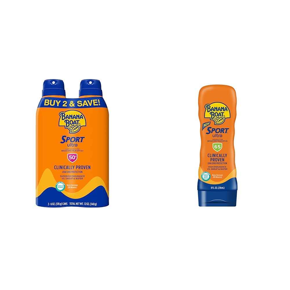 The Banana Boat Sport Ultra Sunscreen Bundle includes one twin pack of SPF 50 sunscreen spray (2 x 6oz bottles) and one 8oz bottle of SPF 65 sunscreen lotion. With superior water and sweat resistance, these sunscreens are designed for active lifestyles, providing strong UVA UVB protection that stays on through outdoor activities. The lightweight spray formula quickly absorbs into skin with a non-greasy feel, while the lotion spreads easily without leaving skin feeling weighed down. Both are formulated to be breathable during physical activity. The SPF 50 spray offers 80 minutes of protection when sweating or in water, while the higher SPF 65 lotion provides maximum defense against 98 of the sun's burning rays. With two different application formats at different SPF levels, this bundle allows you to protect all exposed skin during prolonged sun exposure. Use the easy-to-apply spray for large areas like arms and legs, and the lotion for targeted coverage on the face, ears and neck. The oxybenzone-free formulas provide safe, effective broad spectrum protection.