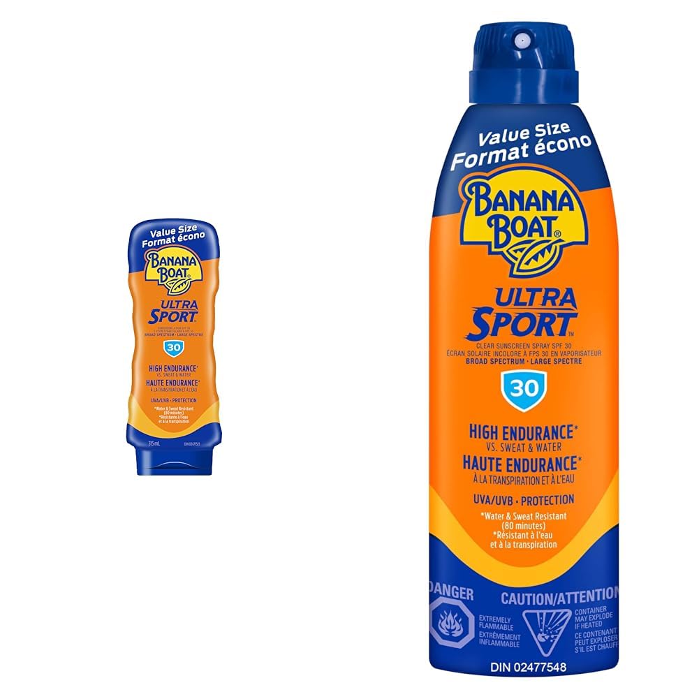 Banana Boat Ultra Sport Sunscreen Lotion, New FORMULA, Spf 30, 315 mL Banana Boat Ultra Sport™ sunscreen is specially formulated to provide high endurance vs. sweat water and stands up to the most active outdoor activities! The lightweight and breathable formula provides broad spectrum UVA UVB protection without feeling heavy or greasy on skin. From family fun to intense competition, Banana Boat allows you to enjoy more fun in the sun! Banana Boat Ultra Sport Sunscreen Spray, NEW FORMULA, Spf 30, Value Size, 226g Banana Boat Ultra Sport™ sunscreen is specially formulated to provide high endurance vs. sweat water and stands up to the most active outdoor activities! The lightweight and breathable formula provides broad spectrum UVA UVB protection without feeling heavy or greasy on skin. From family fun to intense competition, Banana Boat allows you to enjoy more fun in the sun!Product 2: LIGHTWEIGHT BREATHABLE FORMULA - Non-greasy feel won't weigh you down. Product 2: HIGH ENDURANCE VS. SWEAT WATER - Specially formulated for active lifestyles and outdoor sports. Product 1: MADE WITHOUT OXYBENZONE PARABENS. Product 1: REEF FRIENDLY - Made without oxybenzone octinoxate (Hawaii compliant). Product 1: LIGHTWEIGHT BREATHABLE FORMULA - Non-greasy feel won't weigh you down. Product 1: HIGH ENDURANCE VS. SWEAT WATER - Specially formulated for active lifestyles and outdoor sports.