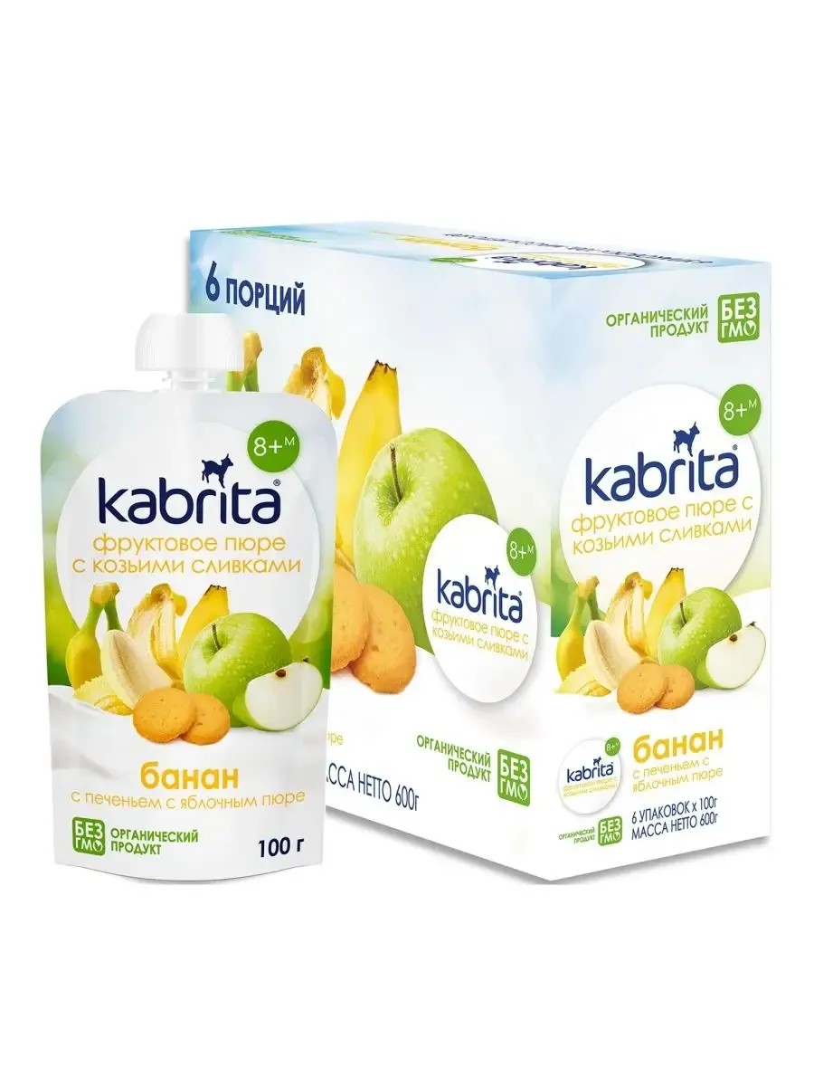 Пюре фруктовое детское Кабрита из спелых бананов, сладких яблок и вкусного детского печенья в сочетании с нежными сливками козьего молока. Детское пюре Kabrita приготовлено без сахара, без крахмала, без консервантов, без вкусовых добавок и ГМО, без глютена. Прекрасное лакомство на любой случай, которое удобно брать с собой. Пюре в мягкой упаковке – идеальное решение для прогулок и перекуса как для малышей, так и для детей более старшего возраста. Пюре детское в мягкой упаковке можно взять в машину: в дорогу или в путешествие. Удобная и опрятная мягкая упаковка способствует развитию мелкой моторики малыша и навыков самостоятельности. Для детей старше 8 месяцев. Состав: пюре банан, пюре яблоко, сливки из козьего молока, органическое печенье. Хранить при температуре от 0 до 25С°. После вскрытия хранить в холодильнике не более 24 часов. Беречь от солнечных лучей. В составе пюре банан, пюре яблоко, сливки из козьего молока, органическое печенье. Козье молоко детское способствует росту и здоровью костей. Детское питание на козьем молоке содержит все необходимые компоненты для гармоничного роста и развития ребенка. Пюре яблочное без сахара способствует укреплению иммунитета. Пюре детское фруктовое имеет мягкую текстуру и приятный вкус.