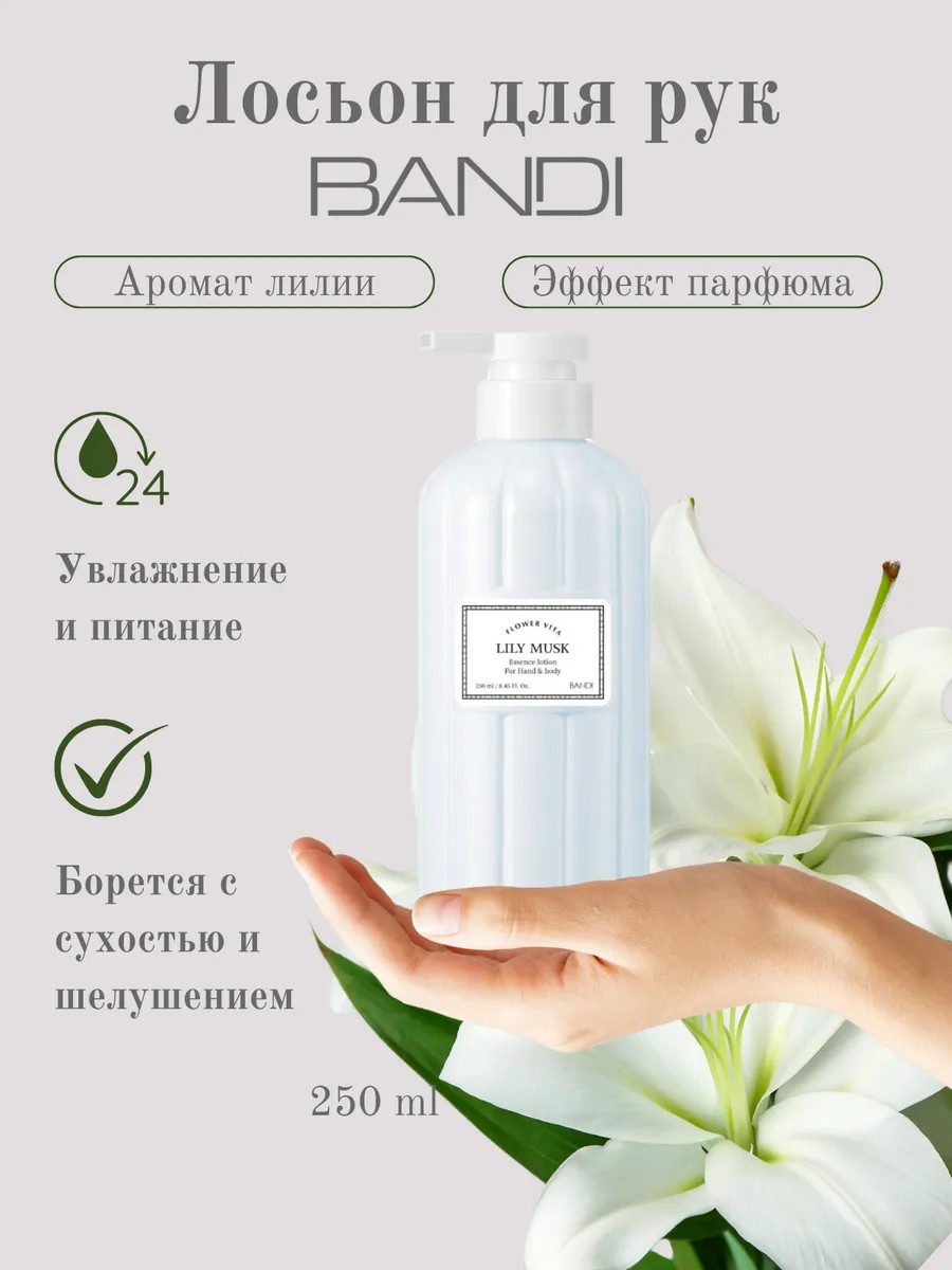 Moisturize your hands with the gentle Flower Vita Essence Lotion Lily Musk. This lotion from the Korean brand BANDI infuses them with vitamins and prevents moisture evaporation for 24 hours. This is achieved thanks to its creamy texture and the inositol it contains. It deeply nourishes and protects, leaving your hands incredibly smooth and velvety. The pleasant, subtle scent lingers on your skin for up to 5 hours.## HOW TO USE: 1. Apply Musk Lily Lotion to your body and hands with gentle massage movements. 2. Allow it to fully absorb.