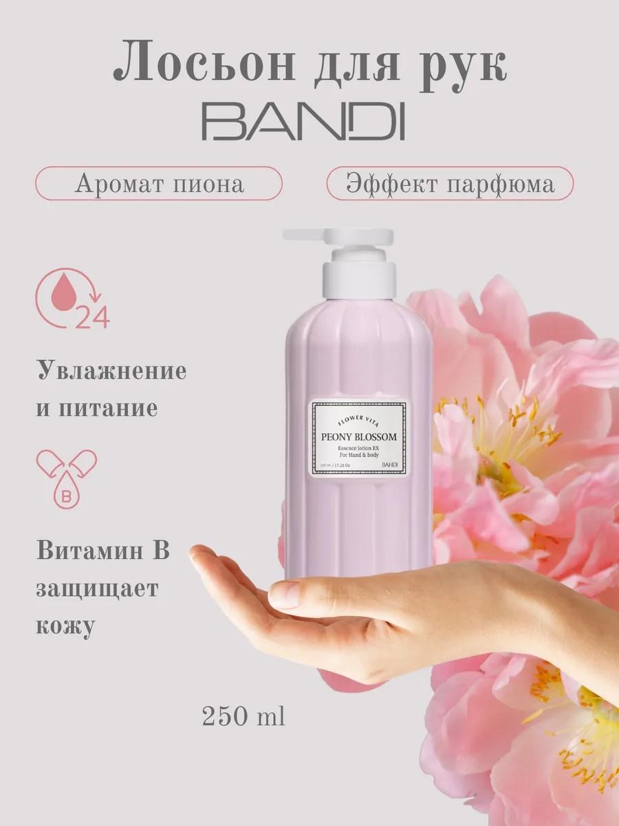 Лосьон для рук Bandi Пион Flower Vita Essence Lotion Peony Blossom обеспечивает коже увлажнение и питание в течении 24 часов. Он изготовлен в Корее. Продукт содержит в составе натуральные экстракты цветов, а также масло сладкого миндаля. Он обладает приятным цветочным приятным ароматом, которая сохраняется на коже в течение длительного времени (до 5 часов). Лосьон содержит витамин B8, который позволяет коже быстро восстанавливаться и обеспечивает надежную защиту от негативных факторов внешней среды. Средство легко распределяется по коже, быстро впитывается и не оставляет после себя жирной пленки.## СПОСОБ ПРИМЕНЕНИЯ1. Мягкими массажными движениям нанесите необходимое количество лосьона на кожу рук и тела.2. Подождите до полного впитывания.