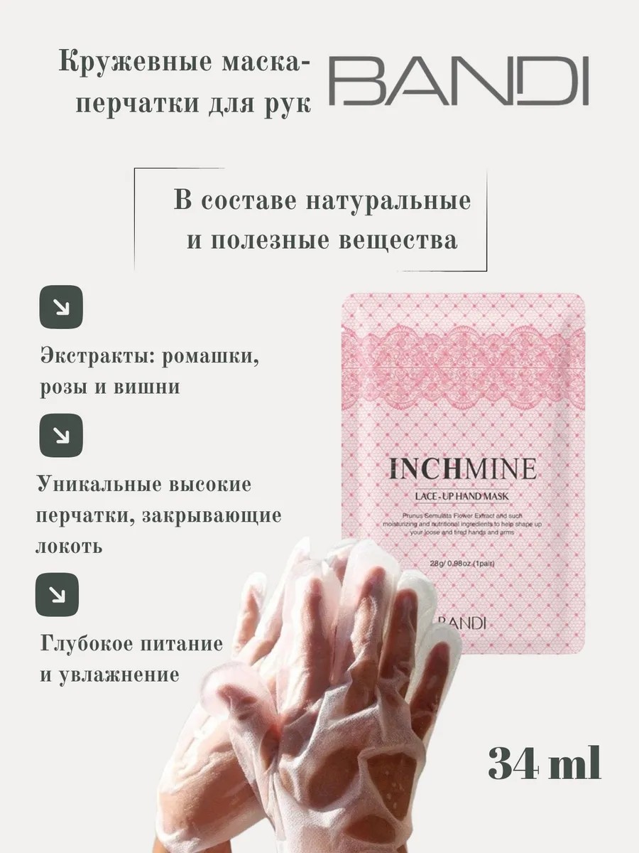 Маска Кружевная для рук - уникальные высокие перчатки-маска, закрывающие локоть.Простой и удобный уход за руками: при минимуме усилий (стоит лишь надеть перчатки-маску), руки получают многокомпонентный полноценный уход.Заметный осветляющий эффект: компонент НИАЦИНАМИД отвечает за превращение кожи из тусклой и серой в обновленную, светящуюся и наполненную жизнью.Глубокое питание, увлажнение и уход: экстракты розы, ромашки, вишни обеспечивают полноценный уход за огрубевшей и сухой кожей рук, включая зону кутикулы.Запатентованный регулятор для различной полноты рук.Сделано из водонепроницаемой ткани снаружи, не позволяющей маске протечь, содержимое маски вводится внутрь перчаток специальным методом, гарантирующим равномерное распределение питательной массы внутри, без комочков и пустых зон.
