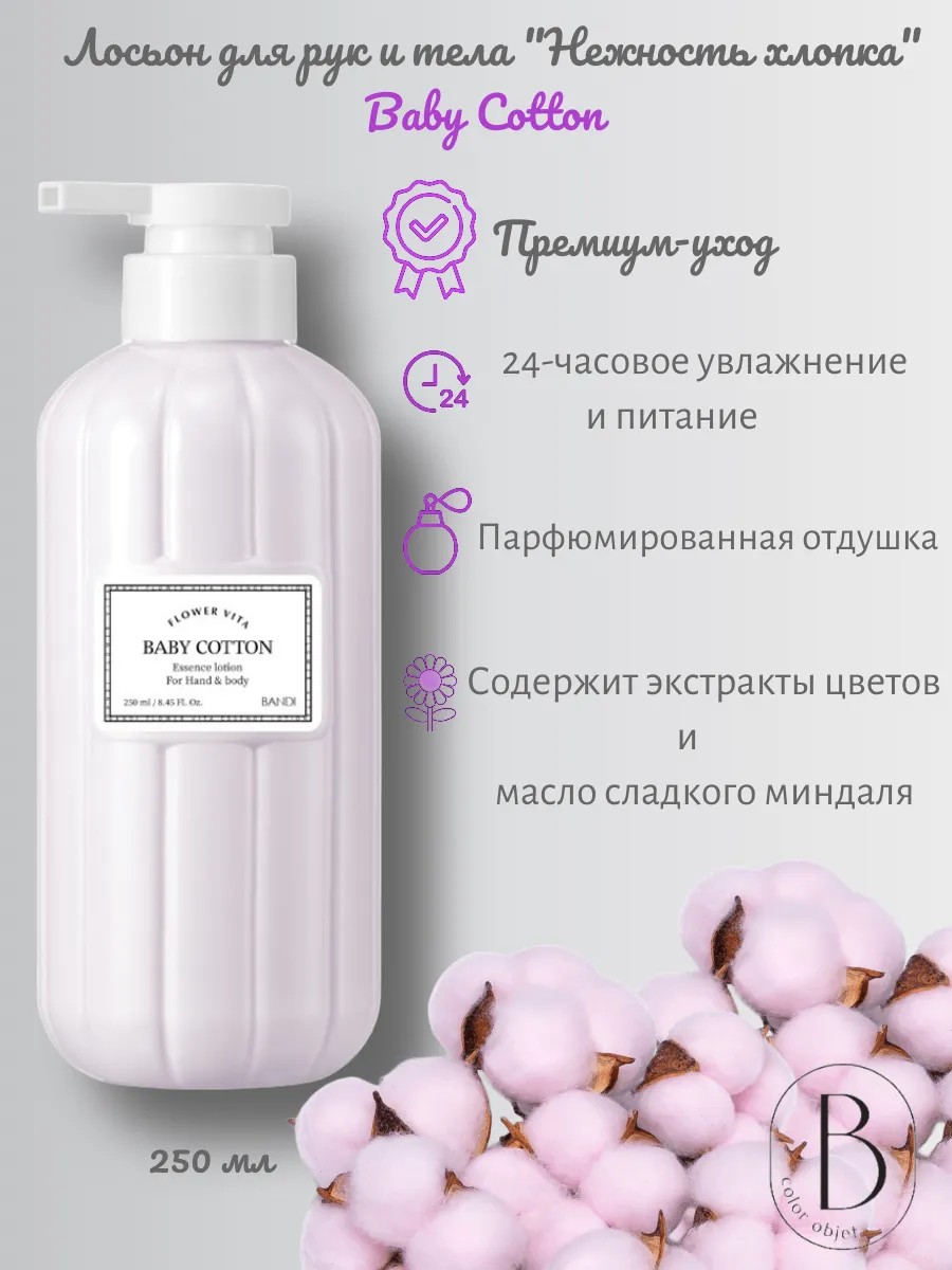 Лосьон «Нежность хлопка» от корейского бренда BANDI глубоко увлажняет кожу рук, эффективно борясь с проблемой сухой, грубой, шелушащейся кожи.