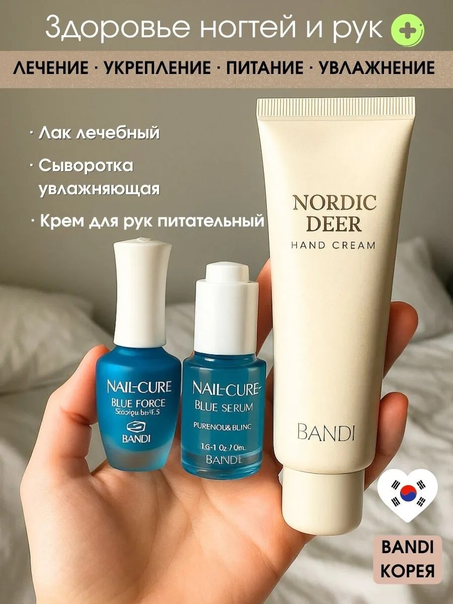 Двухфазная сыворотка в каплях BLUE SERUM, укрепляющий лак для ногтей Blue Force и питательный крем Nordic Deer 100 мл от профессиональной корейской марки BANDI идеален набор для ухода за сухой и чувствительной кожей рук, ногтей и кутикулы. Сыворотка включает минеральные масла и воду, которые действуют синергично, обеспечивая двойное действие, питательное и увлажняющее. Это не только укрепляет ногтевую пластину, но и замедляет рост кутикулы. Удобный дозатор пипетка дает экономное расходование и возможность точно контролировать расход наносимого. Подходит как после завершения маникюра, так и как самостоятельный продукт. Лечебный лак разработан для борьбы с повреждениями, сухостью и образованием вертикальных борозд. Умная эмаль обеспечивает оптимальное увлажнение ногтевой пластины. Железная, лечебная база для ногтей самовыравнивающаяся подходит для ногтей любого типа и клиентов любой возрастной категории, но особенно эффективно взаимодействует с сухими и деформированными ноготочками. Он восстанавливает их структуру. Является первой помощью после снятия гелевого покрытия. Укрепитель высыхает без лампы, что делает его удобным в использовании. Обладает нежным молочным оттенком. Крем идеален для ухода за сухой и чувствительной кожей рук, в любое время года. В его составе находятся мощные компоненты, центелла азиатская обладает восстанавливающим действием, а масла ши и жожоба имеют увлажняющий и питательный эффект. Крем для рук увлажняющий не оставляет липкой пленки и моментально впитывается, даря ощущение комфорта и легкости. Свежий сладкий аромат крема с мочевиной остается надолго, принося приятные моменты. Количество применений в течение суток не ограничено, поэтому вы можете использовать его так часто, как это необходимо. Наша уходовая косметика не тестируется на животных и разработана с любовью к природе. Позвольте себе насладиться непревзойденным качеством и подарите себе настоящую роскошь.