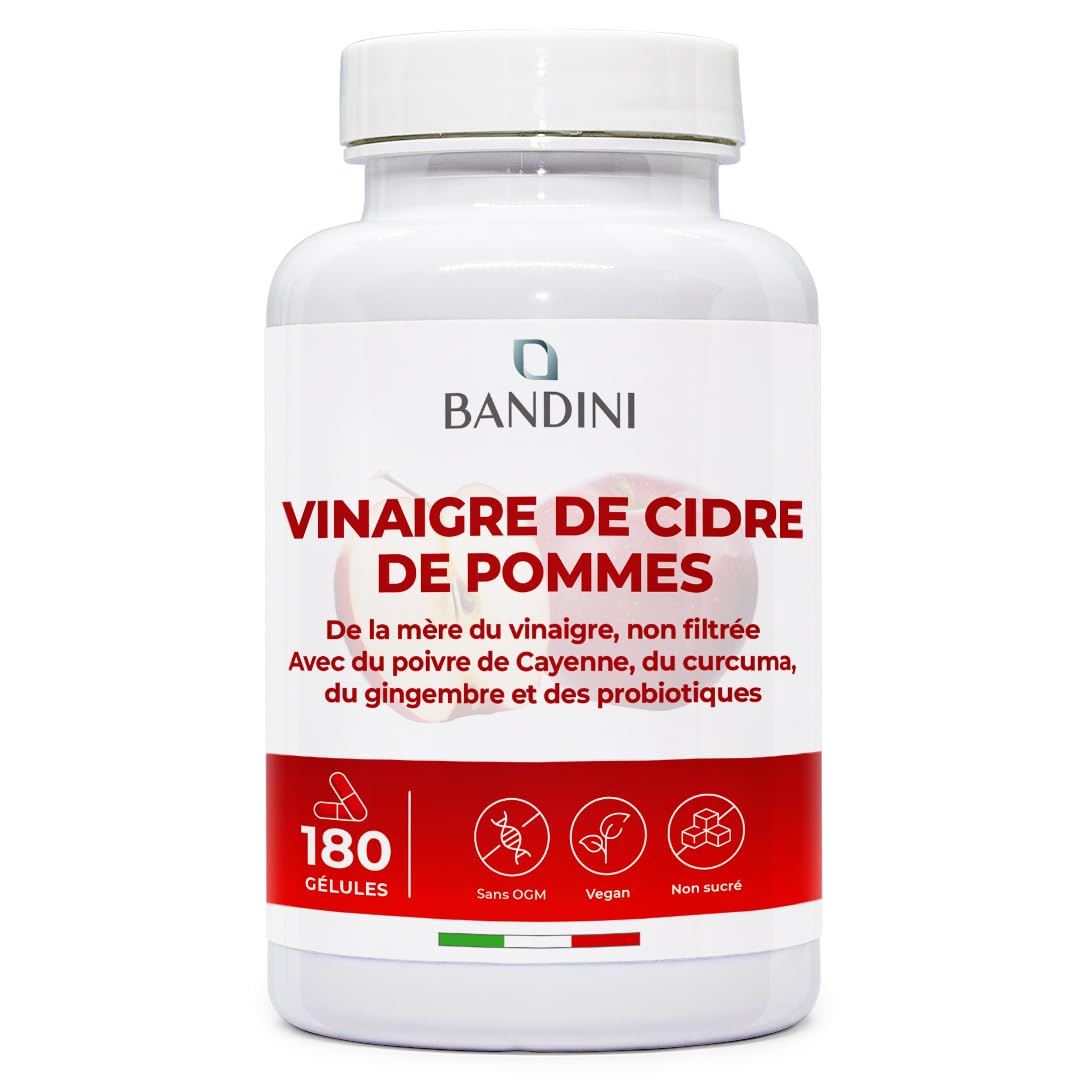 PRODUIT CERTIFIÉ. Bandini Pharma est une entreprise italienne qui propose des produits de santé et de bien-être innovants et de haute qualité de manière dynamique et professionnelle : nos produits sont fabriqués dans notre laboratoire certifié BPF, KOSHER ET HALAL, UNI EN ISO 9001:2015 et ISO 22000. Notre ligne, entièrement fabriquée en Italie, comprend une large gamme de produits avec un excellent rapport qualité-prix. QUALITÉ TESTÉE. Notre formule est végétalienne, de haute qualité, sans additifs indésirables, sans arômes, sans colorants, sans conservateurs, sans OGM. Nous garantissons le plus haut niveau de sécurité et de qualité pour tous nos produits. MODE D'EMPLOI. Prendre 3 gélules par jour, de préférence au cours d'un des repas principaux, accompagnées d'un verre d'eau. Grâce à sa formule en gélules, ce complément est facile à prendre à tout moment de la journée, ce qui le rend idéal pour ceux qui souhaitent un soutien pratique et simple dans leur routine quotidienne. Il est également parfait pour ceux qui suivent des styles d'alimentation spécifiques tels que les régimes végétaliens, céto ou à faible teneur en glucides, en garantissant une supplémentation sans compromis. FONCTIONS. Notre vinaigre de pomme est cru, non filtré et non pasteurisé pour garantir que ses propriétés naturelles restent intactes. Riche en acide acétique et enrichi en souches probiotiques, il est idéal pour ceux qui recherchent un produit naturel pour compléter leur routine quotidienne. HAUTE PERFORMANCE, HAUTE DOSE. Nos capsules de vinaigre de cidre de pomme offrent tous les avantages du cidre de pomme, sans le goût piquant. Chaque dose de 1860 mg comprend une combinaison d'ingrédients naturels, dont le poivre de Cayenne, le gingembre, le curcuma et quatre souches probiotiques soigneusement sélectionnées (lactobacillus gasseri, acidophilus, rhamnosus et Casei), pour un supplément qui soutient votre bien-être quotidien d'une manière simple et naturelle.