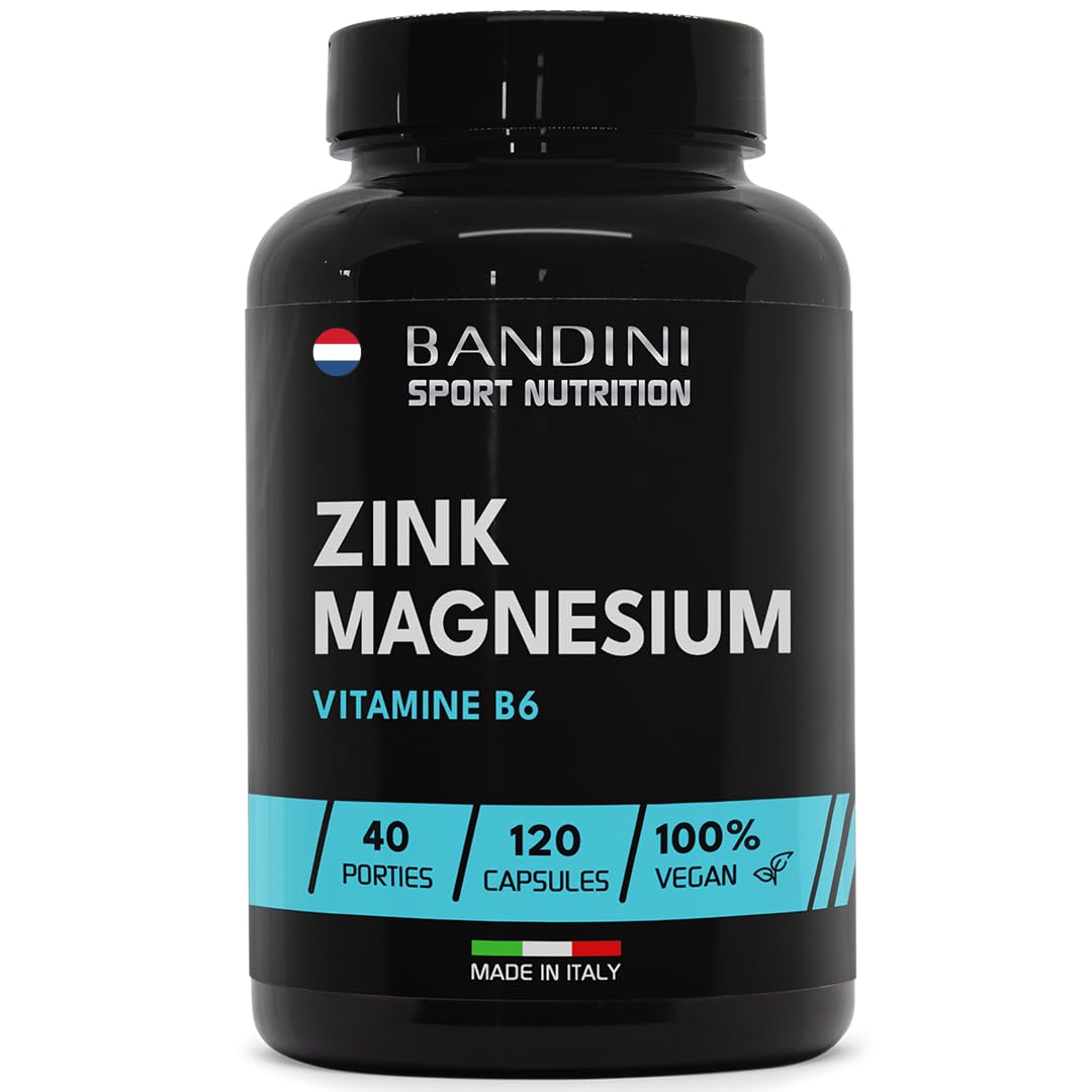 CERTIFIED PRODUCT. Bandini Pharma is an Italian company that offers dynamic and professional services: our products are manufactured in our GMP, KOSHER and HALAL, UNI EN ISO 9001:2015 and ISO 22000:2018 certified laboratory. TESTED QUALITY. Our dietary supplement is of high quality, vegan, GMO-free and is produced without unwanted additives, colorings and preservatives. Our nutritional supplements do not contain any ingredients of animal origin. We guarantee maximum safety and quality for all our products. RECOMMENDED USE. The beneficial effect is achieved by taking 3 capsules of zinc magnesium per day, preferably before going to bed. Each dose is optimally dosed and provides 338 mg magnesium, 9 mg zinc and 7.2 mg vitamin B6. Each pack contains 120 capsules for 40 applications. FEATURES. Our zinc-magnesium capsules reduce fatigue and help you rest, regenerate your body and get a better night's sleep. In addition, it supports protein synthesis and helps maintain normal bones and muscles. It may also promote better regulation of hormone activity. HIGH DOSAGE, HIGH PERFORMANCE. Our Zinc Magnesium ULTRA Complex contains 2 different magnesium compounds (magnesium citrate and magnesium oxide) to make optimal use of all synergy effects. Similar products often contain only one magnesium compound. Our formula contains zinc, magnesium and vitamin B6 to increase your energy. It is particularly suitable for athletes because it promotes muscle building and recovery.Bandini Zink Magnesium ULTRA 120 Capsules (Extra Hoge Dosis), Zink Magnesium Vitamine B6 Energie, Herstel, Spiermassa Vermindert Vermoeidheid en Moeidheid, Voor Mannen en Vrouwen, PostworkoutGECERTIFICEERD PRODUCT. Bandini Pharma is een Italiaans bedrijf dat dynamische en professionele diensten aanbiedt: onze producten worden vervaardigd in ons GMP-, KOSHER- en HALAL-, UNI EN ISO 9001:2015- en ISO 22000:2018-gecertificeerde laboratorium. GETESTE KWALITEIT. Ons voedingssupplement is van hoge kwaliteit, veganistisch, GGO-vrij en wordt geproduceerd zonder ongewenste toevoegingen, kleurstoffen en conserveermiddelen. Onze voedingssupplementen bevatten geen ingrediënten van dierlijke oorsprong. Wij garanderen een maximale veiligheid en kwaliteit voor al onze producten. AANBEVOLEN GEBRUIK. Het gunstige effect wordt bereikt door 3 capsules zinkmagnesium per dag in te nemen, bij voorkeur voor het slapengaan. Elke dosis is optimaal gedoseerd en levert 338 mg magnesium, 9 mg zink en 7,2 mg vitamine B6. Elke verpakking bevat 120 capsules voor 40 toepassingen. EIGENSCHAPPEN. Onze zink-magnesiumcapsules verminderen vermoeidheid en helpen je om uit te rusten, je lichaam te regenereren en een betere nachtrust te vinden. Bovendien ondersteunt het de eiwitsynthese en helpt het bij het behoud van normale botten en spieren. Het kan ook een betere regulering van de hormoonactiviteit bevorderen. HOGE DOSERING, HOGE PRESTATIES. Ons Zink Magnesium ULTRA Complex bevat 2 verschillende magnesiumverbindingen (magnesiumcitraat en magnesiumoxide) om optimaal gebruik te maken van alle synergie-effecten. Vergelijkbare producten bevatten vaak slechts één magnesiumverbinding. Onze formule bevat zink, magnesium en vitamine B6 om je energie te verhogen. Het is bijzonder geschikt voor sporters, omdat het de opbouw en het herstel van spieren bevordert.