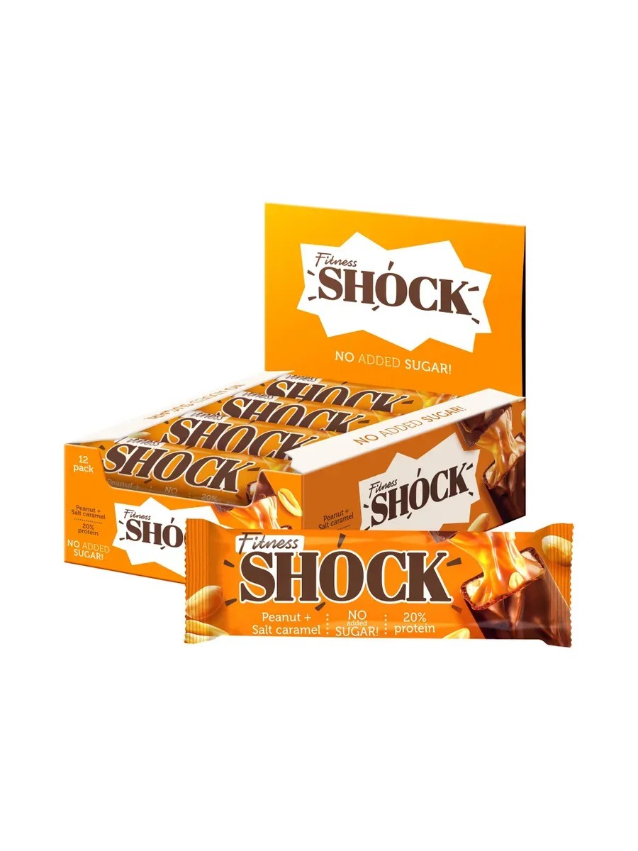 Fitness Shock Salted Caramel Peanut Bar. What happens when you mix sweet, salty, and a little nuttiness? A unique treat that combines amazing taste with health and wellness benefits—the Fitness Shock protein bar.