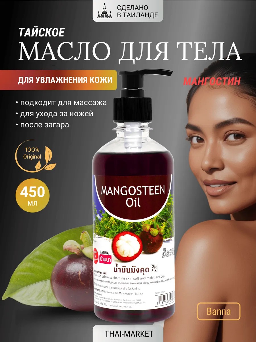 Побалуйте себя уходом с тайским маслом для тела от Banna! Это массажное средство идеально подходит для расслабляющего массажа, увлажнения кожи и борьбы с несовершенствами. Благодаря экстракту мангостина в составе, оно питает и восстанавливает даже самую сухую кожу, делая ее мягкой и шелковистой. Средство помогает уменьшить проявления растяжек и обладает антицеллюлитным эффектом. Идеально подходит как для ежедневного ухода за телом, так и для использования после душа или принятия ванны. Масло Mangosteen Oil можно использовать не только на коже тела, но и на лице или волосах — оно глубоко увлажняет, защищает от воздействия солнца и способствует восстановлению после загара. Подходит беременным женщинам благодаря своему натуральному составу. Этот продукт из Таиланда дарит настоящие минуты релаксации с нежным ароматом мангостина, который напоминает о тропическом отдыхе. Парфюмированная формула средства превращает каждое использование в SPA-ритуал у вас дома. Больше тайских товаров косметики для красоты и здоровья в нашем каталоге - по кнопке THAI-MARKET.