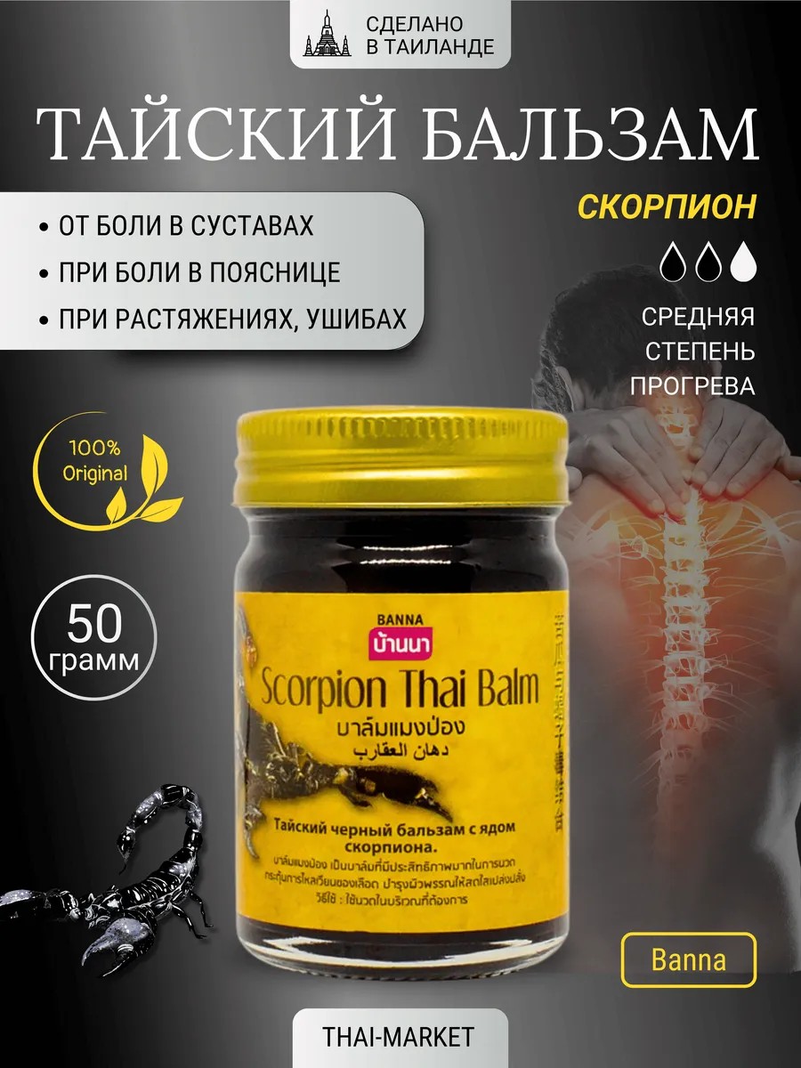 Тайская косметика славится своими натуральными тайскими товарами, и бальзам для тела Banna Scorpion balm 50 мл - не исключение. Эта чудо мазь известна своими уникальными свойствами и широким спектром применения. Идеально подходит для облегчения боли в суставах, мышцах ног и спины. Усиливает кровоснабжение проблемных зон, восстанавливает мышечный тонус. Также помогает при головных болях, хондрозе, радикулите, судорогах, от отеков ног и от простуды. Средняя степень разогрева.