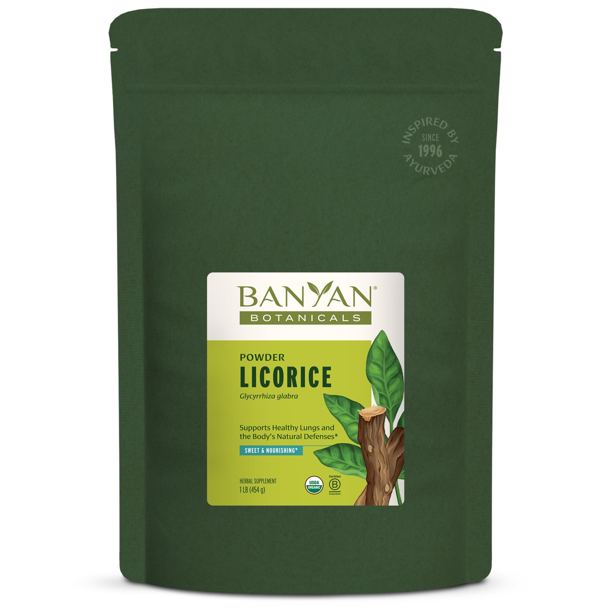 THE BANYAN GUARANTEE—100 Satisfaction: If for any reason you are not satisfied with one of our products, we will gladly accept returns for a full product refund. BANYAN BOTANICALS is committed to producing the highest quality Ayurvedic products using USDA certified organic herbs that are sustainably sourced and fairly traded. All our products are 3rd party tested to ensure product quality and safety. THE SOOTHING LICORICE herb can also be used to support healthy adrenal function and is traditionally used as a rejuvenating tonic to bring overall well-being to the body. . ITS DEMULCENT quality helps to soothe and nourish the tissues of the body while supporting the natural lubrication of the mucosal membranes. Along with the lungs, it also supports healthy digestion and more. . LICORICE ROOT powder (Glycyrrhiza glabra) is a sweet, nourishing herb that is excellent for supporting healthy lungs and respiratory function, including healthy expectoration and clear breathing. .