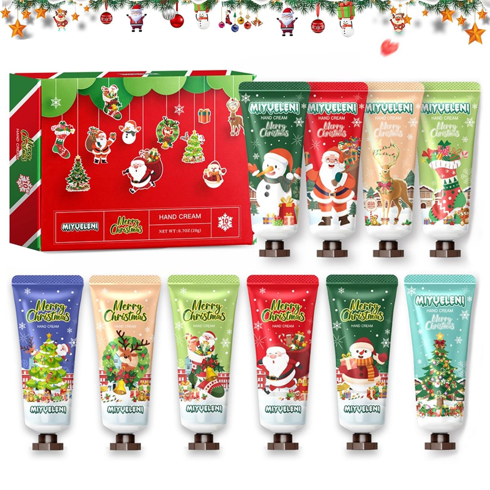 Widely used: This hand cream is suitable for all skin types. It's especially good for dry, dehydrated, and wrinkled skin, as well as for skin with a yellowish tint. It helps moisturize and soften dry skin, deeply nourishing and replenishing it, leaving your hands smoother and softer. It also makes a great gift for family, friends, and colleagues for Christmas, Valentine's Day, Mother's Day, or birthdays. Convenient to carry: Perfect for purses and handbags. It's easy to carry and store, and can be used anytime, anywhere. Always protect and nourish your hands. Nourishing and nourishing: Our hand cream kit is a rich and deeply moisturizing hand cream that leaves hands silky, smooth, and rejuvenated. It deeply nourishes the skin and keeps dry hands smooth and supple. Gentle ingredients: This hand cream is made with natural plant-based ingredients and a variety of moisturizing essences. It has a strong moisturizing effect, provides deep nourishment, is easily absorbed, non-greasy, and leaves your hands feeling refreshed. Christmas gift packaging: This lovely Christmas gift box is specially designed for the holidays and perfectly complements the festive atmosphere. The outer box and packaging are printed with various cute little Christmas elements, making it hard for anyone to put down.Lot de 10 crèmes pour les mains, petits cadeaux de Noël, crèmes pour les mains pour femmes, cadeaux de lutin pour collègues, crèmes pour les mains pour femmeLargement utilisé : cette crème pour les mains convient à tous les types de peau. Particulièrement adapté pour les rides sèches, déshydratées et sèches et les peaux jaune clair. Aide à hydrater et adoucir la peau sèche, à nourrir et à remplir en profondeur, ce qui rend vos mains plus lisses et plus douces. Il peut également être offert à votre famille, vos amis et vos collègues comme cadeau de Noël, de Saint-Valentin, de fête des mères ou d'anniversaire. Confortable à porter : parfait pour les sacs à main et les sacs à main. Il est facile à transporter et à ranger et peut être utilisé à tout moment et n'importe où. Protégez toujours nos mains et nourrissez-les. Nourrissant et nourrissant : notre kit de crème pour les mains est une crème pour les mains riche et profondément hydratante qui rend les mains soyeuses, lisses et rajeunissantes. Nourrit la peau en profondeur et garde les mains sèches et toujours lisses et élastiques. Ingrédients doux : cette crème pour les mains est composée d'ingrédients végétaux naturels et d'une variété d'essences hydratantes. Elle a un fort effet hydratant, une nutrition profonde est facile à absorber, non grasse et vos mains ne sont plus sèches. Emballage cadeau de Noël : cette jolie boîte cadeau de Noël est spécialement conçue pour Noël et s'adapte parfaitement à l'atmosphère de Noël. La boîte extérieure et l'emballage sont imprimés avec différents petits éléments de Noël mignons, de sorte que tout le monde ne peut pas les sortir de la main.