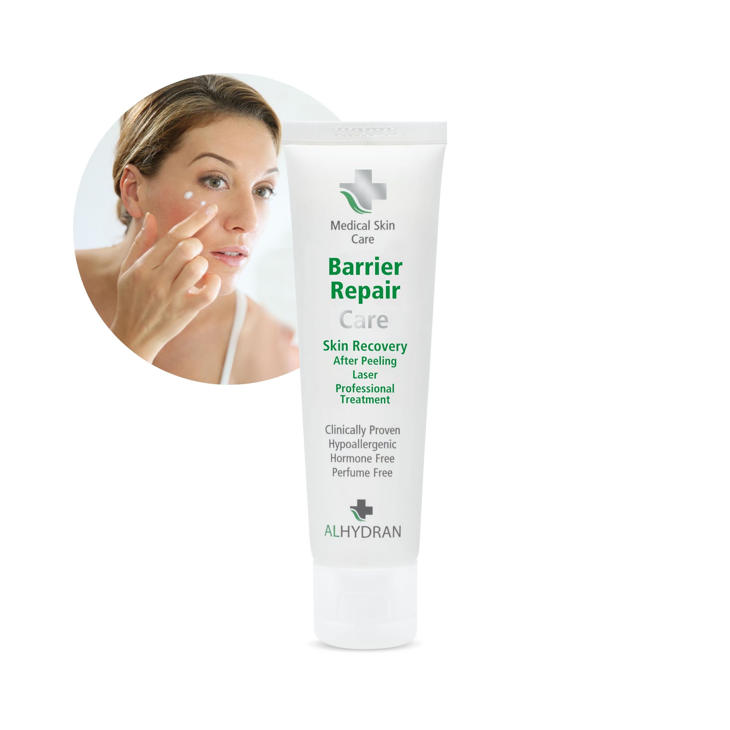 ALHYDRAN Barrier Repair Care is a medical cream for repairing and strengthening the skin barrier. This medical cream ensures that the skin with a damaged skin barrier is restored to balance. Supports skin recovery during the after-treatment of recently (professionally) treated skin. The barrier cream provides optimal and long-lasting hydration, has a soothing effect, strengthens the natural skin barrier and provides immediate comfort for the skin. ALHYDRAN Barrier Repair Care is suitable for all skin types and skin conditions as aftercare for (medical) skin treatment, such as peelings, laser and other professional treatments. The cream is hypoallergenic and contains no parabens, fragrances or hormones. Properties ALHYDRAN Barrier Repair Care is a moisturizing, medical cream with freshly processed Aloe Vera gel as the main ingredient. Because the percentage of Aloe Vera gel in this repairing cream is so high, ALHYDRAN Barrier Repair Care has strong moisture-binding properties. The cream hydrates the skin all day long and is enriched with vitamins, natural oils, Beta-Glucan, Bisabolol and Allantoin. All ingredients contribute to calming, repairing and strengthening the skin barrier. Indications areas of application: Aftercare for chemical peels and laser treatments. Aftercare for medical or cosmetic treatments Aftercare for intensive skin treatments with (medical) cosmetics. Support for the after-treatment of damaged skin. Support for skin that reddens quickly or reacts sensitively. Preventive care for irritated and reactive skin. Support for skin that is poorly tolerated by most cosmetics. To strengthen the skin (booster serum). By applying a thin layer under the regular day and or night cream. Apply a thin layer after sun exposure or sunburn. INGREDIENTS Aloe Barbadensis Leaf Juice (Aloe Vera Gel from Aruba), Aqua (Water), Caprylic Capric Triglyceride, Glyceryl Stearate, Cetearyl Isononanoate, Decyl Oleate, Cetyl Alcohol, Stearyl Alcohol, Polysorbate 60, Glycerin, Beta-Glucan, Sorbitan Stearate, Ceteareth-20, Bisabolol, Propylene Glycol, Allantoin, Cetearyl Alcohol, Cetyl Palmitate, Ceteareth-12, Phenoxyethanol, Caprylyl Glycol, Chlorphenesin, Tocopheryl Acetate (Vit.E), Simmondsia Chinensis Seed Oil (Jojoba Oil), Ascorbic Acid (Vit.C), Disodium EDTA.HYPOALLERGENIC CREAM Our hypoallergenic cream, free of parabens, fragrances and hormones, offers a safe and effective solution for sensitive skin types, where purity and care come together for optimal skin care. ALL SKIN TYPES Suitable for all skin types, Alhydran provides a versatile and effective solution for optimal skin care, regardless of your skin type, and promotes health and hydration. MEDICAL POWER FOR SKIN RECOVERY An advanced medical cream, provides effective repair and strengthening of the skin barrier, restoring balance and supporting the natural healing process, ideal for post-treatment after medical procedures.NAZORG HUIDBEHANDELING - Ondersteuning genezingsproces van de huid - Alle huidtypen - Vrij van parabenen, geurstoffen en hormonen - Aloë vera gel - 59 ML ALHYDRAN Barrier Repair Care is een medische crème voor herstel en versterking van de huidbarrière. Deze medische crème zorgt dat de huid met een beschadigde huidbarrière weer in balans komt. Ondersteunt het huidherstel bij de nabehandeling van de recent (professioneel) behandelde huid. De barriere crème zorgt voor een optimale en langdurige hydratatie, werkt verzachtend, versterkt de natuurlijke huidbarrière en zorgt voor direct comfort voor de huid. ALHYDRAN Barrier Repair Care is geschikt voor alle huidtypen en huidcondities als nazorg bij (medische) behandeling van de huid, zoals peelings-, laser- en overige professionele behandelingen. De crème is hypoallergeen en bevat geen parabenen, geurstoffen en hormonen. Eigenschappen ALHYDRAN Barrier Repair Care is een hydraterende, medische crème met vers verwerkte Aloë Vera-gel als hoofdingrediënt. Omdat het percentage Aloë Vera-gel in deze herstellende crème zo hoog is, heeft ALHYDRAN Barrier Repair Care sterke vochtbindende eigenschappen. De crème hydrateert de huid de hele dag door en is verrijkt met vitamines, natuurlijke oliën, Beta-Glucan, Bisabolol en Allantoin. Alle ingrediënten dragen bij aan het kalmeren, herstellen en versterken van de huidbarrière. Indicaties toepassingsgebieden: Nazorg bij chemische peelings en laserbehandelingen. Nazorg bij medische- of cosmetische behandelingen Nazorg bij intensieve behandelingen van de huid met (medische) cosmetica. Ondersteuning bij de nabehandeling van een beschadigde huid. Ondersteuning van de huid die snel rood wordt of gevoelig reageert. Preventieve zorg bij een geïrriteerde en reactieve huid. Ondersteuning van de huid die de meeste cosmetica slecht verdraagt. Als versterking van de huid (booster serum). Door een dun laagje aan te brengen onder de reguliere dag- en of nachtcrème. Na zonblootstelling of zonverbranding een dun laagje aanbrengen. INGREDIËNTEN Aloe Barbadensis Leaf Juice (Aloe Vera Gel from Aruba), Aqua (Water), Caprylic Capric Triglyceride, Glyceryl Stearate, Cetearyl Isononanoate, Decyl Oleate, Cetyl Alcohol, Stearyl Alcohol, Polysorbate 60, Glycerin, Beta-Glucan, Sorbitan Stearate, Ceteareth-20, Bisabolol, Propylene Glycol, Allantoin, Cetearyl Alcohol, Cetyl Palmitate, Ceteareth-12, Phenoxyethanol, Caprylyl Glycol, Chlorphenesin, Tocopheryl Acetate (Vit.E), Simmondsia Chinensis Seed Oil (Jojoba Oil), Ascorbic Acid (Vit.C), Disodium EDTA.HYPOALLERGENE CRÈME Onze hypoallergene crème, vrij van parabenen, geurstoffen en hormonen, biedt een veilige en effectieve oplossing voor gevoelige huidtypes, waarbij puurheid en zorg samenkomen voor optimale huidverzorging. ALLE HUID TYPEN Alhydran is geschikt voor alle huidtypen, biedt een veelzijdige en doeltreffende oplossing voor optimale huidverzorging, ongeacht uw huidtype, en bevordert gezondheid en hydratatie. MEDISCHE KRACHT VOOR HUIDHERSTEL Een geavanceerde medische crème, biedt doeltref