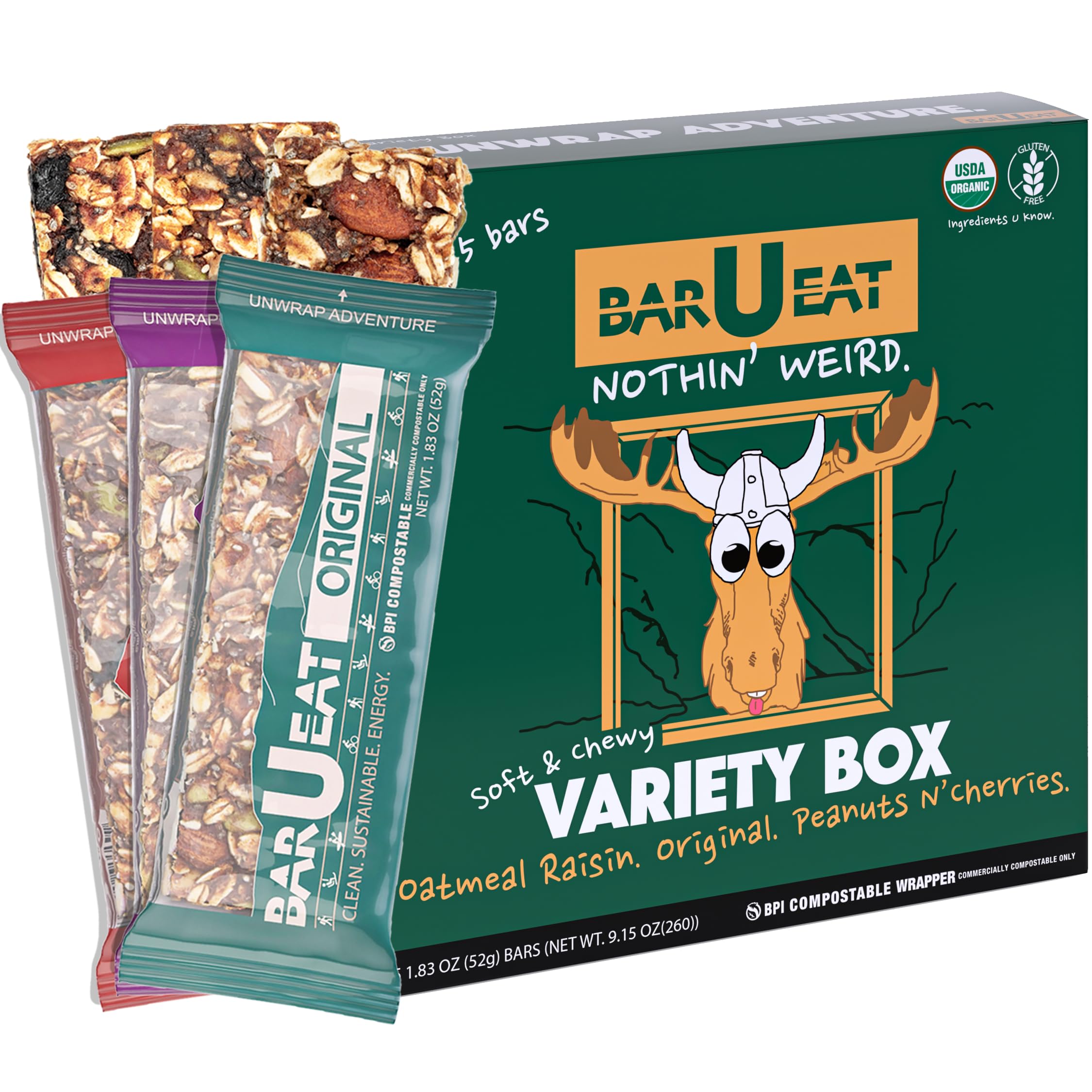 BAR-U-EAT Gluten-Free Organic Soft & Chewy Energy Bar. Real Food | Seed Oil Free | No Artificial Sugar | Compostable Packaging | Healthy Snacks (Variety 5 Pack)