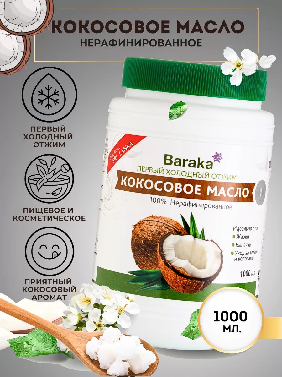 | Комплектация | Кокосовое масло Baraka Нерафинированное 1000мл - 1шт. |