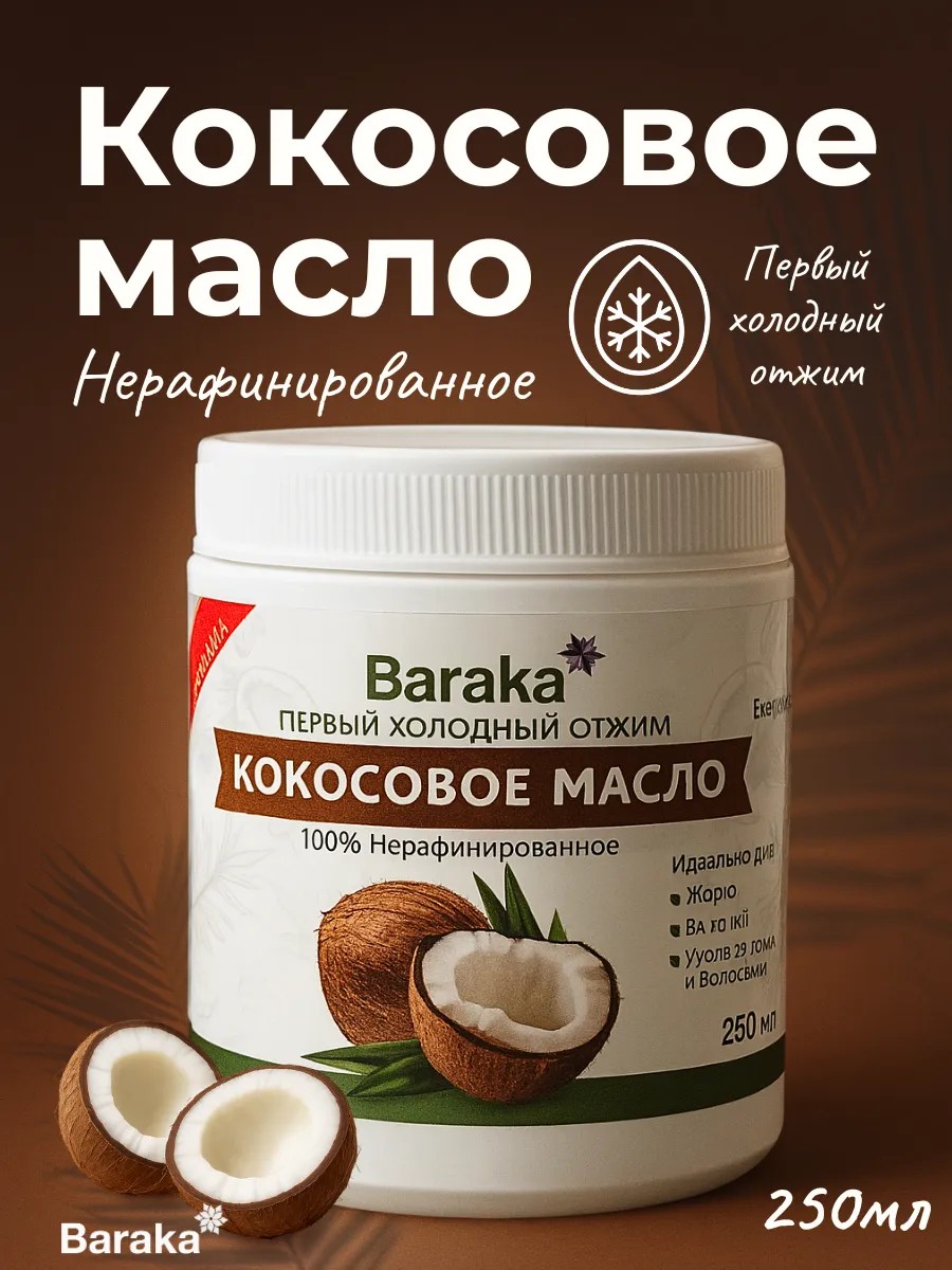 Кокосовое масло нерафинированное Baraka – это источник здоровья и красоты, который станет незаменимым помощником в вашем ежедневном уходе. Это натуральное и качественное масло холодного отжима прекрасно подходит для кулинарии, идеально дополняя разнообразные блюда и выступая в роли универсального ингредиента для приготовления пищи. Оно идеально подходит для жарки, так как выдерживает высокие температуры, сохраняя полезные свойства. Используйте это пищевое масло в своих рецептах правильного питания и веган продуктов.
