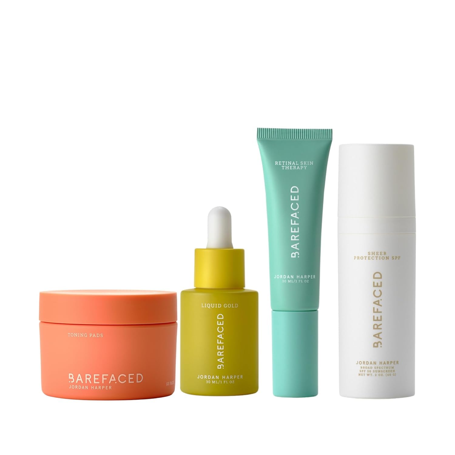 Barefaced was founded by Nurse Practitioner Jordan Harper after a decade of treating patients, embracing the "Less is Better" philosophy to create more effective, streamlined skincare.Barefaced was founded by Nurse Practitioner Jordan Harper after a decade of treating patients, embracing the "Less is Better" philosophy to create more effective, streamlined skincare. Broad-Spectrum Mineral SPF 50 Defense Without a White Cast – this lightweight, sheer SPF hydrates, smooths, and brightens skin with hyaluronic acid, lactic acid, niacinimade, and pathenol. Caffeine helps tighten the appearance of pores, reduce puffiness, and promote a refreshed, smoother complexion. An Upgrade on Retinol - RetinAL Skin Therapy features RetinAL, a cutting-edge ingredient that is 20x stronger and works 11x faster than traditional retinols, with a time-released formula for superior results. Designed for those who struggle with retinoid sensitivity, RetinAL includes soothing bakuchiol and other calming ingredients to minimize irritation while delivering visible results. Foundation for Skin Health: Toning Pads gently exfoliate, unclog pores, and smooth skin while reducing redness and boosting the effectiveness of your skincare routine. AHAs, BHAs, and antioxidants work together to minimize dark spots, sun damage, pores, and rough texture. Powerful Antioxidant Blend - Liquid Gold goes beyond a typical Vitamin C Serum for Face with 15 Vitamin C, a powerhouse ingredient that evens skin tone, and shields against environmental stressors. It's a collegen-boosting, multitasking serum that minimizes fine lines and wrinkles.