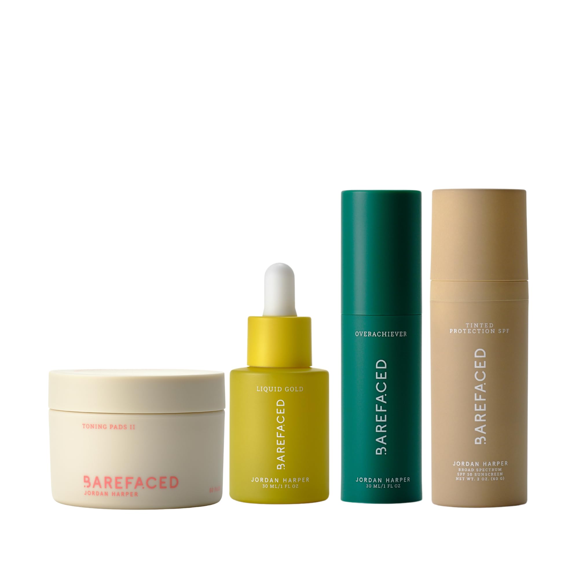 Are you underwhelmed by the results from your current skincare routine? To see your best skin, it needs to be functioning at its best—and our Core Four (Retinoid Alternative) is the perfect combination to help you get there. These foundational essentials work together to improve overall skin wellness, strengthen your skin barrier, and elevate your routine. The Core Four reduce fine lines, encourage collagen production, even tone, and defend against free radical damage, while exfoliating, unclogging pores, and providing UV protection. Including Overachiever, a retinal alternative or booster, to enhance these results by promoting cell turnover and boosting the effectiveness of your routine, all while brightening and hydrating for a healthier, more radiant complexion.Barefaced was founded by Nurse Practitioner Jordan Harper after a decade of treating patients, embracing the "Less is Better" philosophy to create more effective, streamlined skincare. Enhanced Tinted Protection Formula: designed for all skin types and tones, this broad-spectrum, oil-free sunscreen provides full coverage and effective UVA and UVB protection. It hydrates, brightens, and smooths skin. Ultimate Skin Multitasker - Overachiever is a 10-in-1 serum that strengthens the skin barrier, boosts retinoid efficacy, and serves as a gentle alternative, ideal for all skin types, including during pregnancy. Packed with pro-collagen ingredients, Overachiever improves skin firmness while amplifying the anti-aging benefits of your retinoids. Intensified Toning: Toning Pads II offer more than just toning - they exfoliate and brighten with an advanced blend of acids while clearing blocked pores, refining skin texture, and reducing redness. Powerful Antioxidant Blend - Liquid Gold goes beyond a typical Vitamin C Serum for Face with 15 Vitamin C, a powerhouse ingredient that evens skin tone, and shields against environmental stressors. It's a collegen-boosting, multitasking serum that minimizes fine lines and wrinkles.