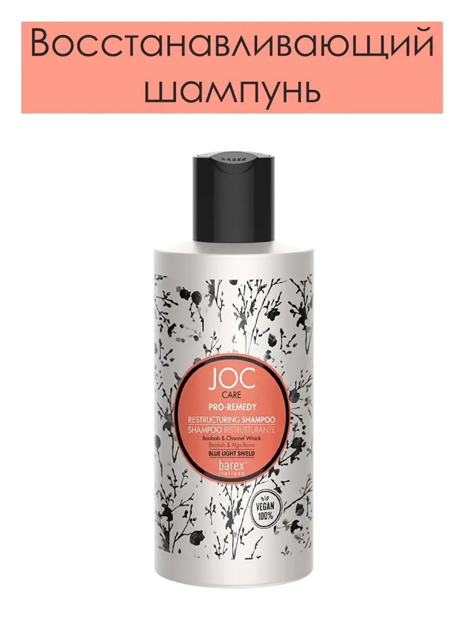 PRO-REMEDY Restructuring Shampoo with Baobab and Channel Wrack, 250 ml, JOC CARE Restructuring Shampoo with Baobab and Channel Wrack, pH 5.8 - restores and deeply nourishes, adding strength and shine. Restores natural moisture levels and facilitates combing. Blue Light Shield protects against damage caused by HEV radiation from electronic devices. Baobab has a powerful restorative effect, moisturizes, nourishes and strengthens, adds softness, and facilitates combing. Channel Wrack - restores damaged hair scales, has an intense moisturizing effect, instantly adds softness and exceptional shine. We strive to make a positive impact on people and the environment through beauty. JOC CARE products are 100% vegan. NO PARABENS, NO DYES, DERMATOLOGICALLY TESTED. Application: Apply to damp hair, massage and leave for a few minutes, then rinse. Barex Italiana is a famous brand of professional hair cosmetics from Italy. Contains a full range of hair care products. Professional Italian care cosmetics Barex Jock Care Pro Remedy have a wide range of functions, providing a cleansing, moisturizing and strengthening, restoring and smoothing effect, nourishing and volumizing. The Barex Italiana assortment is widely represented by products for hairdressers and beauty salons, coloring and cutting, which is why Barex is very popular among hairdressers and stylists. In our professional brand, you will find a wide selection of products for shine, radiance, restoration and protection, nutrition and hydration, cleansing, strengthening weakened split ends. Original - there is an original certificate of declaration. You can always contact our professional technologists through the "Questions" section in the product card for advice on the use of products and help in choosing a cosmetic product.