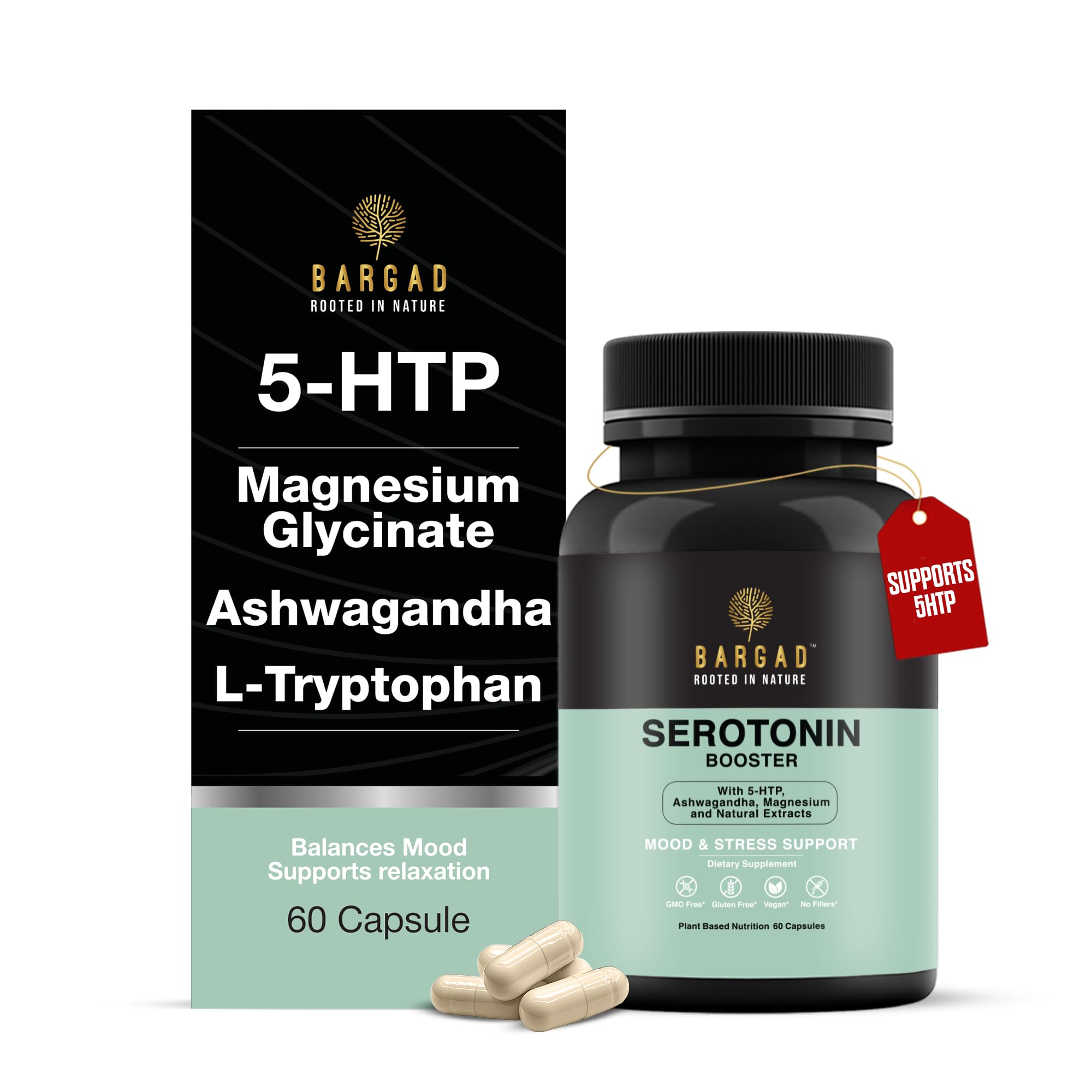 Bargad Serotonin Support Supplement Helps Boosts 5HTP Serotonin & Cortisol Levels Herbal Blend Promotes Positive Mood Calmness Stress Relief | Happy Mood & Brain Support | 60 Capsule