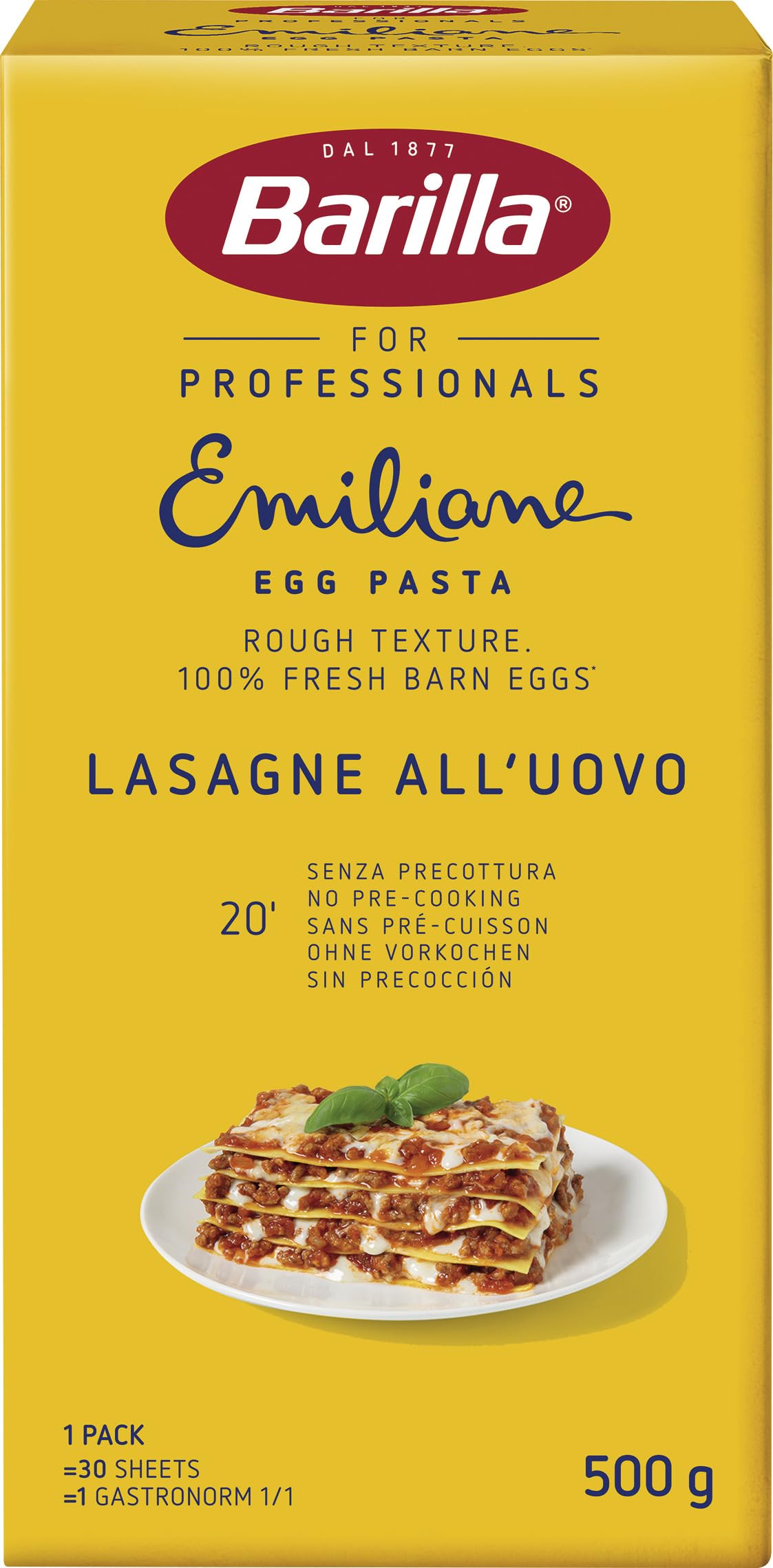 BAILLA CHEF EMILIANE LASAGNA These wide, flat egg pasta sheets are perfect for all your oven-baked specialties. Premium egg pasta rooted in Italian tradition. Pressed through bronze dies, they are made with selected durum wheat and 100 fresh, free-range eggs. With its rich flavor and slightly rough texture, it clings perfectly to any sauce. 145 years of experience in the culinary world. We want to inspire you with our products and enable you to delight your guests with authentic and contemporary Italian cuisine. What began as a local family business over 145 years ago has grown into a world-leading manufacturer of Italian pasta. With our "Barilla for Professionals" range, we use this experience to specifically enhance the culinary offerings of professional users. INGREDIENTS Ingredients: Blue Cheese Seed, Eggs 19.36 (4 per kg). INSTRUCTIONS Oven cooking time: 20 minutes - No cooking required See more