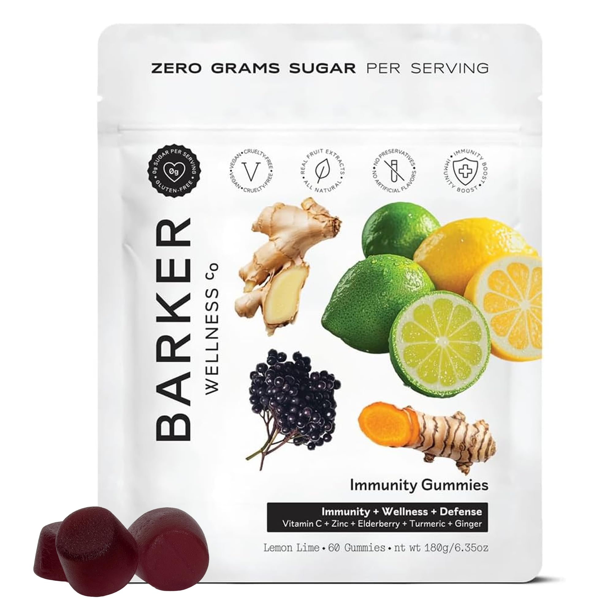 Barker Wellness Immunity Gummies with Vitamin C Zinc Elderberry Turmeric & Ginger for Daily Immune Support | Vegan Sugar-Free Lemon-Lime Flavor | Seasonal Wellness Essentials 60 Count