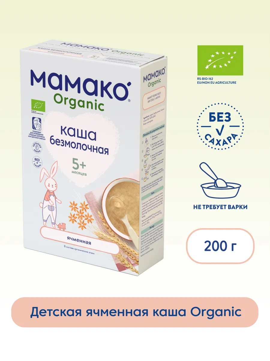 ➢ Безмолочная органическая детская ячменная каша MAMAKO Органик идеально подойдет для расширения рациона ребенка с 5 месяцев. Быстрого приготовления, легко усваивается благодаря нежной консистенции.