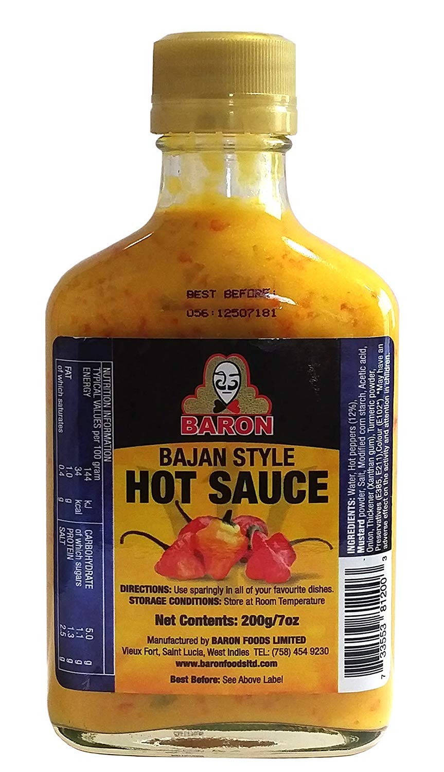 Baron Bajan Style Hot Sauce is delicious on all your favorite dishes. Use this speciality sauce sparingly. INGREDIENTS Water, Hot peppers (12 ), Mustard powder, Salt, Modified corn starchm Acetic acid, Onion, Thickener (Xanthan gum), Turmeric powder, Preservatives (E385, E211), Colour (E102 ) DIRECTIONS Use sparingly in all your favorite dishes. Store at room temperature. LEGAL DISCLAIMER Statements regarding dietary supplements have not been evaluated by the FDA and are not intended to diagnose, treat, cure, or prevent any disease or health condition. See more