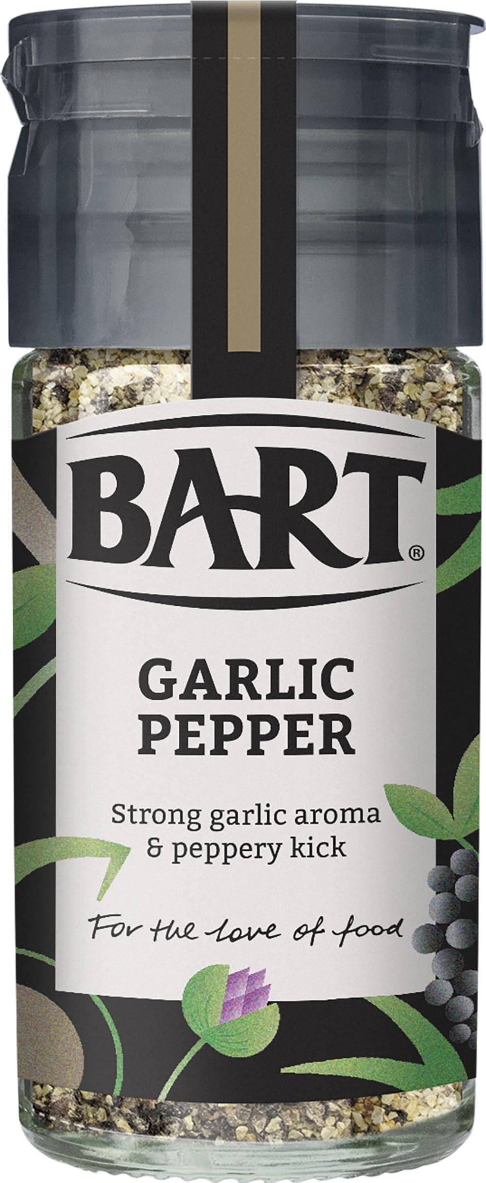 Bart's has been discovering, selecting, and sharing the finest spices, herbs, and seasonings from around the world for over 50 years in a relentless quest for great flavor to brighten every kitchen, plate, and face across the UK. Garlic pepper combines to make a delicious seasoning. It works particularly well with red meats. Mix with olive oil and rub it on steak, sprinkle it over Italian pasta dishes, or add it to salt for salt and pepper squid. INGREDIENTS Garlic, Pepper