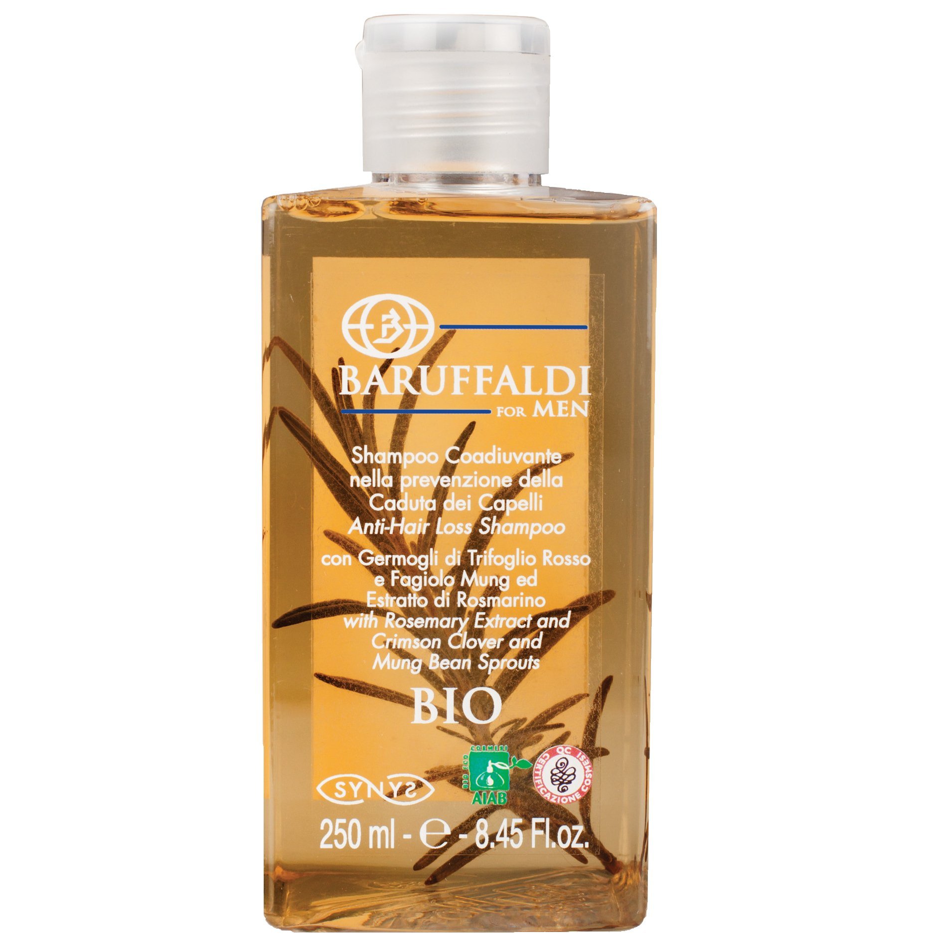 Organic shampoo to help prevent hair loss, with red clover germ, mung bean, and rosemary extract. Patented SYNYS process. Ingredients: aqua, ammonium lauryl sulfate, glycerin, disodium cocoyl glutamate, cocamidopropyl betaine, decyl glucoside, citric acid, sodium cocoyl glutamate, coco-glucoside, glyceryl oleate, (trifolium pratensinigna radiata) sprout extract, rosmarinus officinalis extract, rosmarinus officinalis leaf oil, cedrus atlantica bark oil, lavandula angustifolia oil, citrus aurantium dulcis fruit water , saponaria officinalis extract, alcohol denat., potassium sorbate, sodium benzoate, tetrasodium glutamate diacetate, linalool. sustainable agricultureMade in Italy. Sprout extract, Rosmarinus officinalis extract, Rosmarinus officinalis leaf oil, Cedrus atlantica bark oil, Lavandula angustifolia oil, Citrus aurantium dulcis fruit water (sustainable agriculture), Saponaria officinalis extract, alcohol denat., potassium sorbate, sodium benzoate, tetrasodium glutamate diacetate, linalool. Ingredients: Aqua, ammonium lauryl sulfate, glycerin, disodium cocoyl glutamate, cocamidopropyl betaine, decyl glucoside, citric acid, sodium cocoyl glutamate, coco-glucoside, glyceryl oleate, (Trifolium pratensinigna radiata). Patented SYNYS process. Organic shampoo to aid in the prevention of hair loss with red clover sprouts, mung bean, and rosemary extract.Shampooing BIO à l'Extrait de Romarin Adiuvante dans la Prévention de la Chute des Cheveux 250 ml - BaruffaldiBio for Men Made in ItalyDESCRIPTION DU PRODUIT Shampooing BIO adiuvante dans la prévention de la chute des cheveux aux germes de tréfle rouge, de haricot mungo et à l'extrait de romarin. Processus SYNYS breveté Ingredients: aqua, ammonium lauryl sulfate, glycerin, disodium cocoyl glutamate, cocamidopropyl betaine, decyl glucoside, citric acid, sodium cocoyl glutamate, coco-glucoside, glyceryl oleate, (trifolium pratensenigna radiata) sprout extract, rosmarinus officinalis extract rosmarinus officinalis leaf oil, cedrus atlantica bark oil, lavandula angustifolia oil, citrus aurantium dulcis fruit water , saponaria officinalis extract, alcohol denat., potassium sorbate, sodium benzoate, tetrasodium glutamate diacetate, linalool. agriculture soutenableFabriqué en Italie. sprout extract, rosmarinus officinalis extract rosmarinus officinalis leaf oil, cedrus atlantica bark oil, lavandula angustifolia oil, citrus aurantium dulcis fruit water (agriculture soutenable), saponaria officinalis extract, alcohol denat., potassium sorbate, sodium benzoate, tetrasodium glutamate diacetate, linalool. Ingredients: aqua, ammonium lauryl sulfate, glycerin, disodium cocoyl glutamate, cocamidopropyl betaine, decyl glucoside, citric acid, sodium cocoyl glutamate, coco-glucoside, glyceryl oleate, (trifolium pratensenigna radiata). Processus SYNYS breveté. Shampooing BIO adiuvante dans la prévention de la chute des cheveux aux germes de tréfle rouge, de haricot mungo et à l'extrait de romarin.