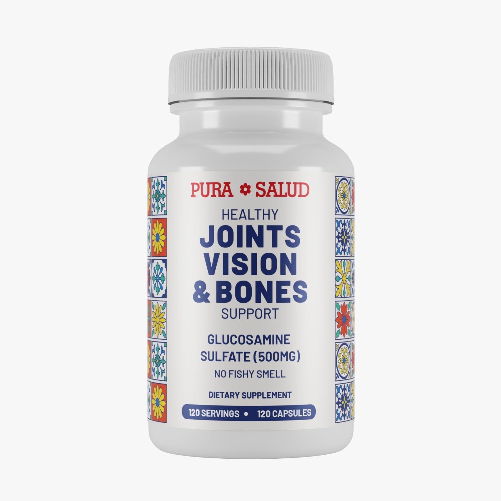 Introducing Pura Salud Pureflex Glucosamine Sulfate, a cutting-edge dietary supplement meticulously formulated to provide comprehensive support for joint, eye, and bone health. With a potent 500mg dose of Glucosamine Sulfate, this supplement is specially designed to promote and maintain optimal joint function, helping you stay active and mobile. At Pura Salud, we are dedicated to delivering the vitamins, minerals, and supplements, tailored to meet the specific needs of Hispanic men and women. We understand that health goals vary from person to person, and that's why our product line is uniquely crafted to cater to your individual lifestyle and well-being objectives. With a focus on quality and efficacy, our products are proudly manufactured in the USA, adhering to strict industry standards. We are committed to providing you with the best in health and wellness, so you can confidently make Pura Salud a part of your daily routine. Unleash your potential and experience the Pura Salud difference with Pureflex Glucosamine Sulfate. It's more than just a supplement it's your key to maintaining flexible joints, supporting healthy eyes, and promoting strong bones. Take charge of your health and embark on a journey to a healthier, happier you with Pura Salud Pureflex Glucosamine Sulfate. These statements have not been evaluated by the Food and Drug Administration. This product is not intended to diagnose, treat, cure, or prevent any disease.Trusted by Basic Brands: Proudly made in the USA by Basic Brands, following strict cGMP quality standards for consistency, safety, and performance. Extended 45-day supply: Take one capsule twice daily with meals. Designed to support general joint health as part of a balanced diet. . Promotes Bone Eye Health: Formulated to support bone strength and eye wellness, helping you stay active and maintain overall wellness as you age. Supports Comfortable Movement: Glucosamine helps maintain joint flexibility and smooth movement, supporting overall joint comfort and daily mobility. Joint, Vision Bone Support Formula: Pura Salud PUREFLEX delivers 500 mg of Glucosamine Sulfate per capsule to support healthy joints, cartilage, and bone mobility for active lifestyles.
