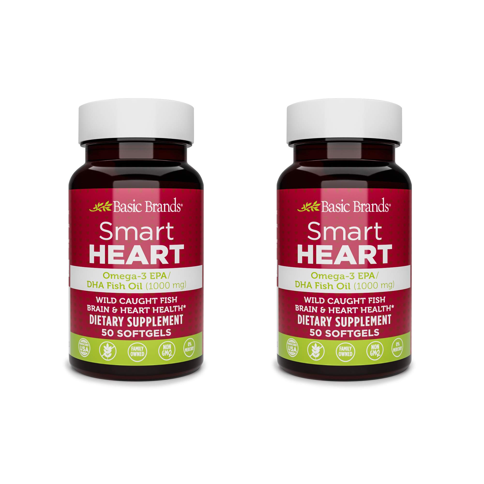 Basic Brands Smart Heart Omega-3 Fish Oil 1000mg - Triple Strength EPA & DHA Non-GMO Heart & Cognitive Support - 50 Burpless Softgels - 2-Pack 50 Count (Pack of 2)
