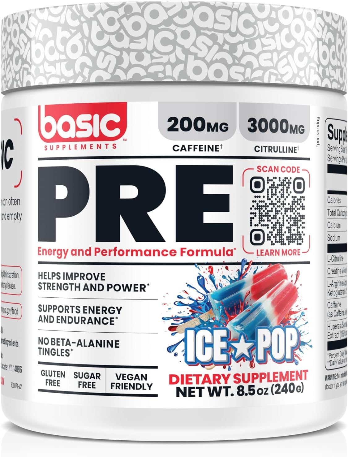 Basic Pre-Workout with 200mg Caffeine and 3000mg Citrulline for Energy Focus and Strength Support No Beta-Alanine Tingles Vegan Gluten-Free Sugar-Free