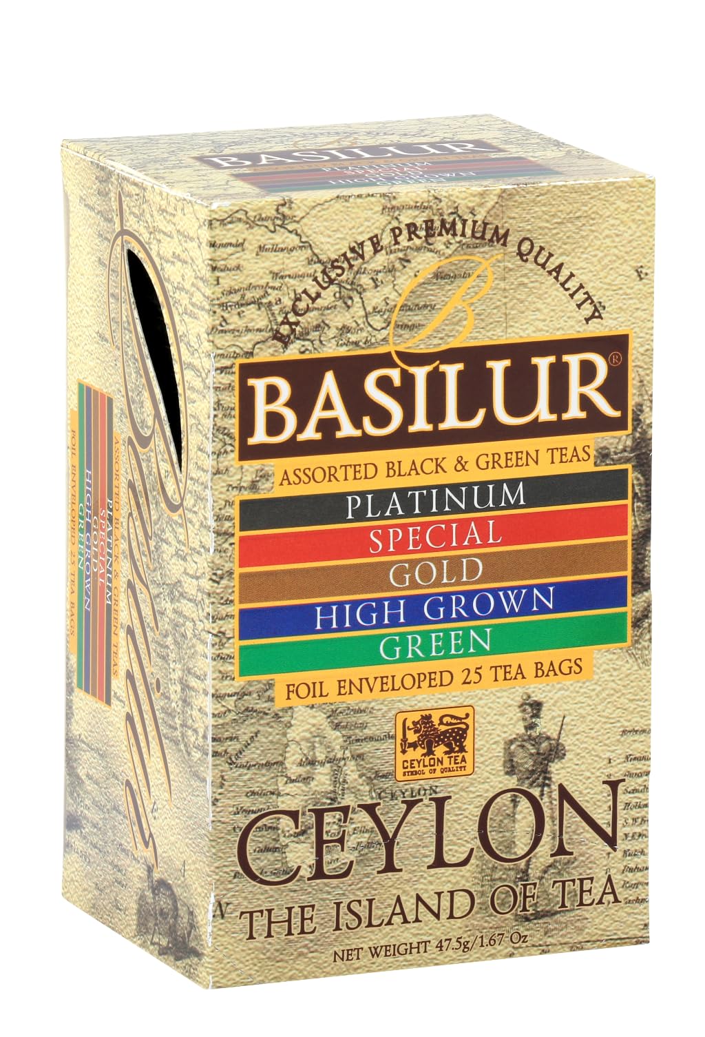Pack of 2 Basilur Cylon tea bags with 5 types of tea: - Platinum - Ceylon Black Tea - Special - Ceylon Black Tea with Buds - Golden - Ceylon Black Tea - High Grown - Ceylon Black Tea - Green - Ceylon Green Tea