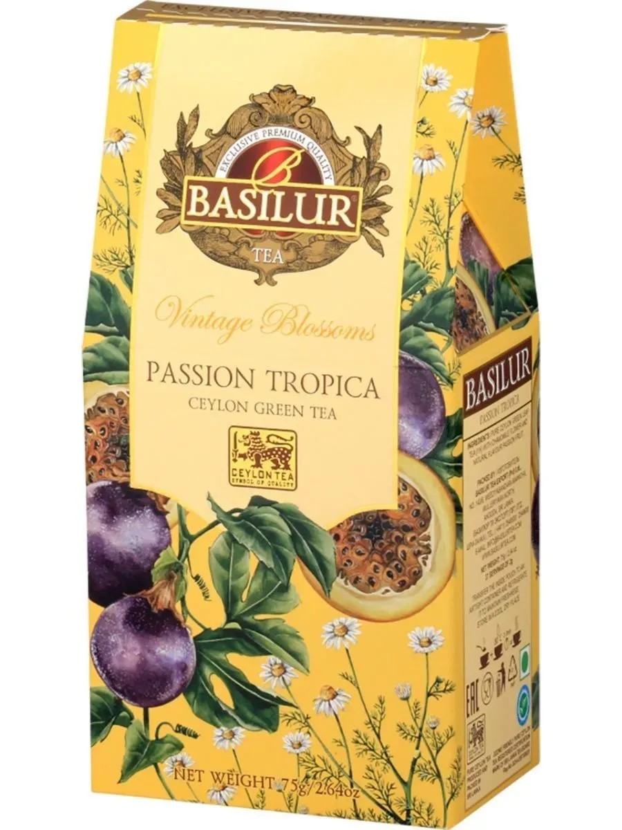 Чай зеленый листовой байховый цейлонский Basilur Тропическая страсть 75 гр.(Vintage Blossoms, Passion Tropica) - премиальный продукт с лепестками ромашки т натуральным ароматом маракуйи.