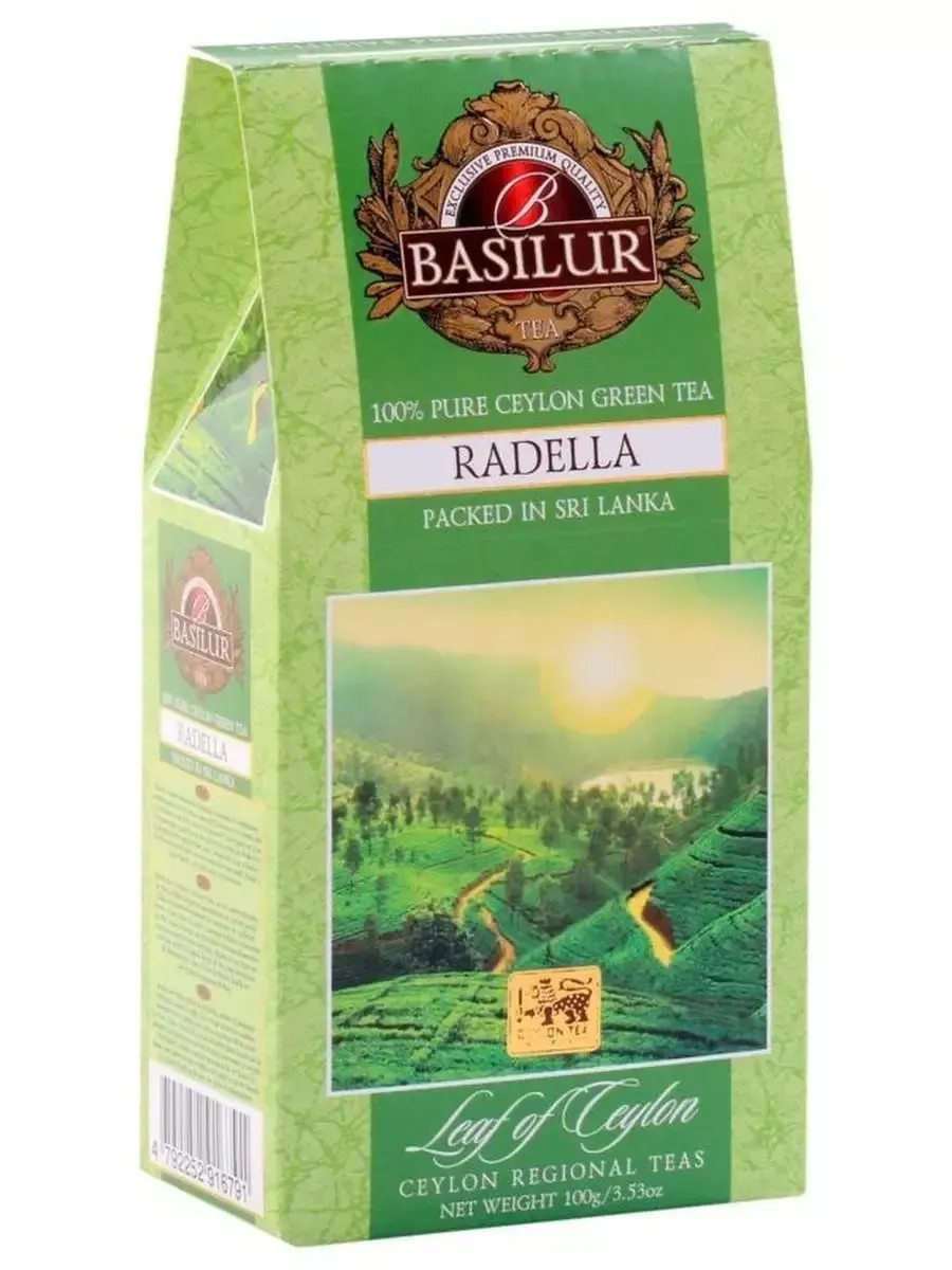 Basilur Чай Лист Цейлона "Раделла" 100 г, зеленый. Чай зелёный цейлонский байховый листовой Basilur «Radella Green». Среди горных вершин, покрытых туманами расположена Radella. Место с идеальными климатическими и почвенными условиями для выращивания одного из лучших сортов чая в мире. Целебные свойства и освежающий вкус цейлонского чая удовлетворят даже самых взыскательных ценителей этого напитка. Чашка зеленого чая Basilur «Radella Green» с легким освежающим эффектом успокоит ваши чувства и поднимет настроение.
