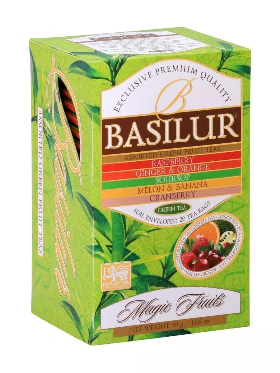 Чай в пакетиках Basilur "Magic fruits" ASSORTED GREEN 25 шт - это ассорти из пяти видов зеленых чаев с натуральными добавками фруктов и ягод: с натуральной малиной; с имбирем и апельсином; с натуральным ароматизатором саусэпа; с кусочками банана и дыни и с кусочками клюквы.