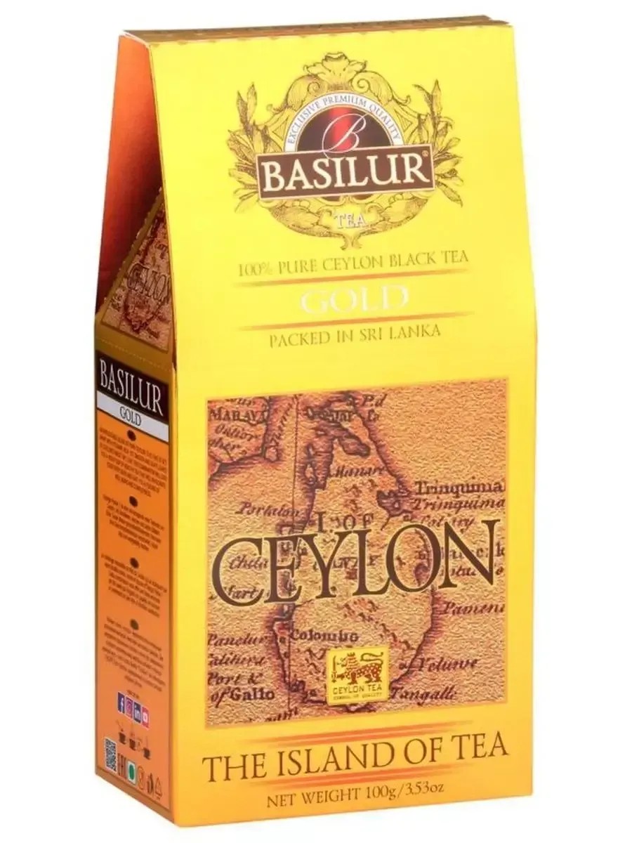 Basilur, Чай Остров "Золотой" 100 г, черный Orange Pekoe 1. Высокий стандарт листового цейлонского чая, который сочетает в себе полноту вкуса с тонкими оттенками аромата, а благородный золотистый цвет его настоя делает чай поистине драгоценным. Способ приготовления: залить в заварочном чайнике кипятком и настоять 3-5 минут. Условия хранения: в месте без посторонних запахов при относительной влажности воздуха не более 70% при температуре от 0 до 25 °С. Изготовлено из качественного сырья по всем спецификациям и ГОСТам, имеет сертификацию бренда со всеми стандартами ТУ и санитарно-эпидемиологических нормативов. Производитель гарантирует свежесть и аромат продукта на протяжении всего срока годности.
