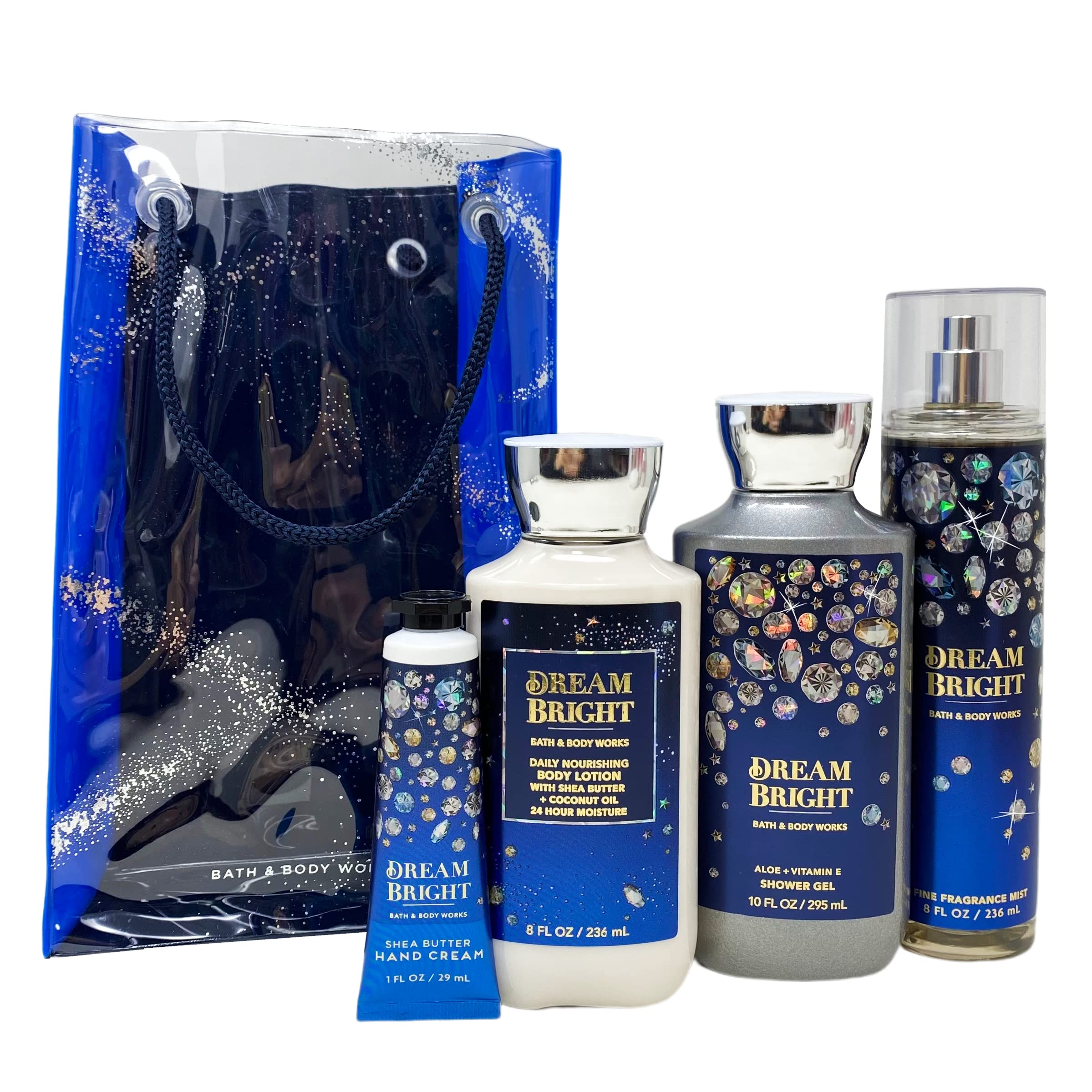 Bath and Body Dream Bright Gift Set Bag Includes daily nourishing body lotion (8 fl oz), shower gel (10 fl oz), fine fragrance mist (8 fl oz) and hand cream (1 fl oz) Product comes arranged inside a transparent gift bag