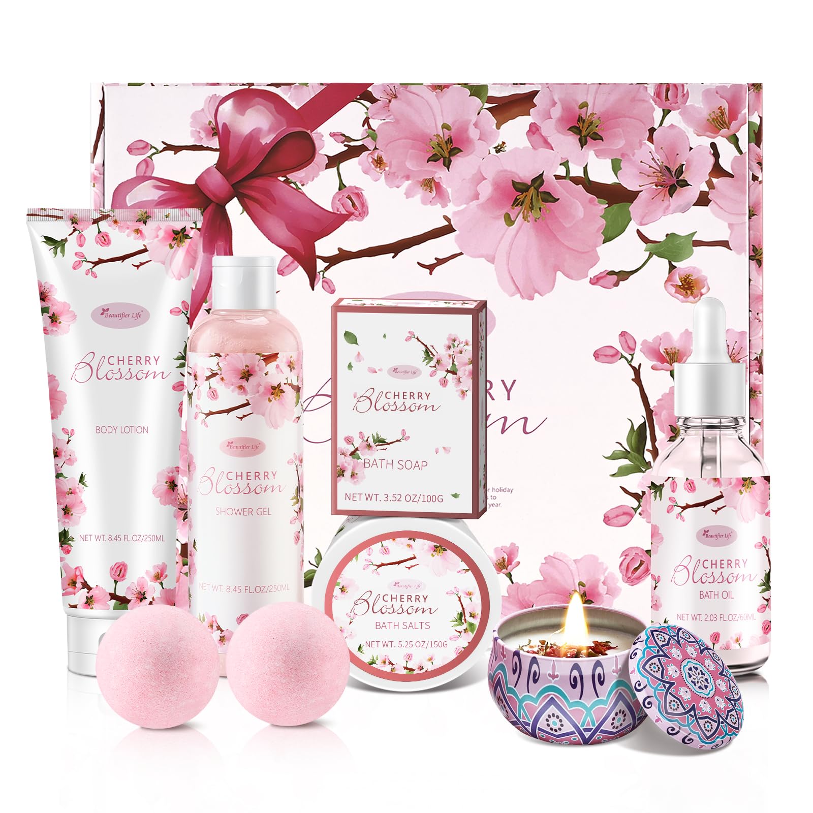 Love's Messenger - Emotional Bonds: Our bath and body care set, perfect for loved ones, partners, or friends, becomes a messenger of affection. Bridging hearts in special occasions or daily routines, it transforms gift-giving into emotional exchanges. Each use is a conduit for love, turning self-care into intimate conversations and treatments into soul-enriching experiences. This gift, a medium for emotional connection, enables love to be shared with every use, commemorating life's treasured moments. Shared Tranquility for Daughters & Mothers: Our Bath and Body Gift Set for Women & Girls is a bridge between generations, fostering moments of shared tranquility. Ideal for mothers and daughters to bond over, this set invites them to enjoy a ritual of rejuvenating baths enriched with the nurturing essences of bath oil and bath salts, followed by the tender application of body lotion, all enveloped in the enchanting aroma of cherry blossoms. Elevate Everyday to Exquisite: Upgrade her daily rituals to moments of sheer indulgence with Beautifier Life's Bath and Body Gift Set. Each of the seven premium items, from the invigorating Shower Gel to the soothing Scented Candle, is crafted to turn her home into a sanctuary of luxury and calm. Every use becomes an exquisite experience, blending the finest ingredients with the enchanting scent of Japanese Cherry Blossom. Timeless Memories - The Gift of Classic Fragrance: On every occasion worth commemorating—Mother's Day, birthdays, anniversaries, Christmas, Valentine's Day, or Thanksgiving.The refined aroma of Japanese cherry blossoms imbues each celebration with a touch of timeless elegance, making your gift a symbol of exquisite joy. This gift, wrapped with love and filled with memories, is not just a physical surprise, but a channel for emotional expression, transforming each festival into a cherished memory, an eternal keepsake. Lavish Indulgences for Her: Treat the remarkable women in your life to the epitome of pampering with our Beautifier Life Bath and Body Gift Set for Women. This sumptuous 7-Piece Spa Gift Set boasts a collection of premium products: Shower Gel, Body Lotion, Bath Oil, Bath Salts, Soap, Bath Bombs, and a Scented Candle. Each item is carefully selected to provide a comprehensive and opulent spa experience, transforming her home into a personal retreat of indulgence.