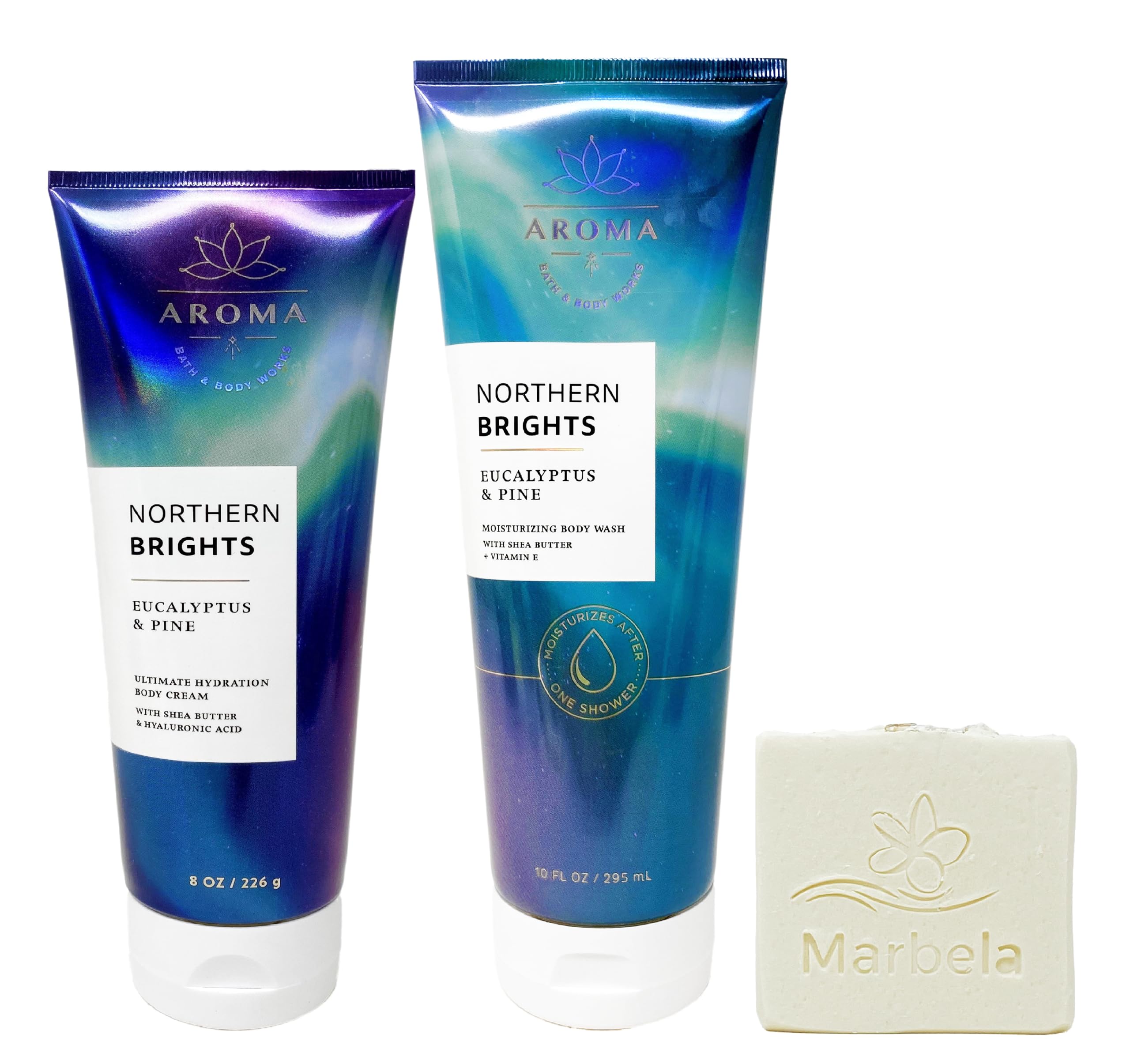 Bath and Body Work AROMA Northern Brights EUCALYPTUS & PINE Body Cream and Moisturizing Body Wash Gift Set with a Natural Oats Bar Soap. INCLUDES: 8 oz / 226 g Ultimate Hydration Body Cream, 10 fl oz / 295 mL Moisturizing Body Wash, and a 4 oz Natural Oats Bar Soap. EUCALYPTUS & PINE - A blended aroma of eucalyptus essential oil and pine extract to inspire & captivate. Embrace a blissful moment in a nordic forest and experience the beauty of the dancing Northern Lights. Natural Oats Bar Soap - Natural Oats is most gentle formula for any skin type! Oats help to cleanse, exfoliate and soothe irritation. In addition, the sweet almond oil leaves skin soft and pampered. This soap was made for people with sensitive skin because we realize what a battle that can be. Notes of: This soap is UNSCENTED in order to be sensitive skin friendly.