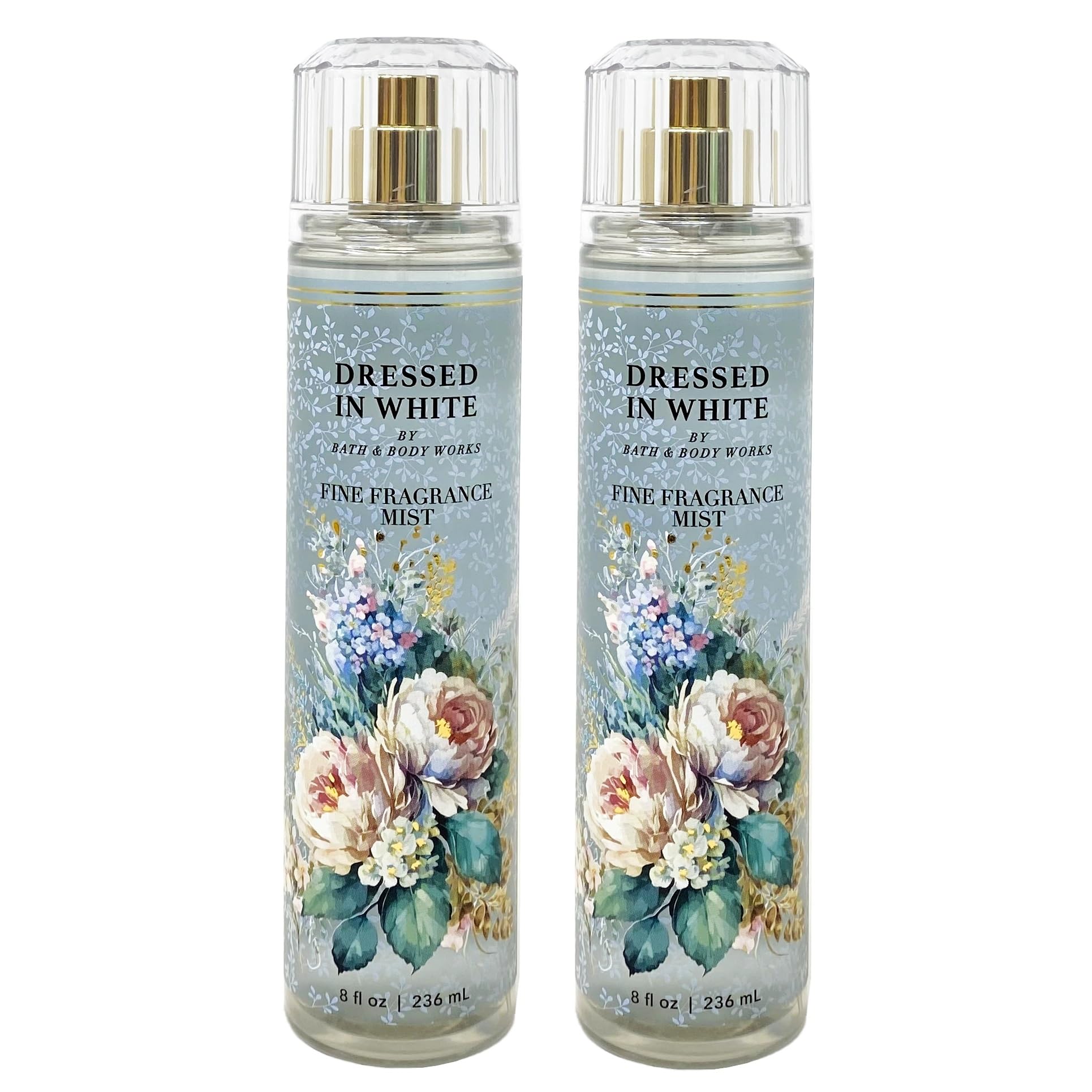 Bath and Body Work DRESSED IN WHITE Fine Fragrance Mist Bundle. INCLUDES: 2 Fine Fragrance Mists (8 fl oz / 236 mL each). What it smells like: the start of a beautiful adventure. Fragrance notes: pear blossom, ivory gardenia and satin woods. What it does: scents your skin with a mist that's super layerable.