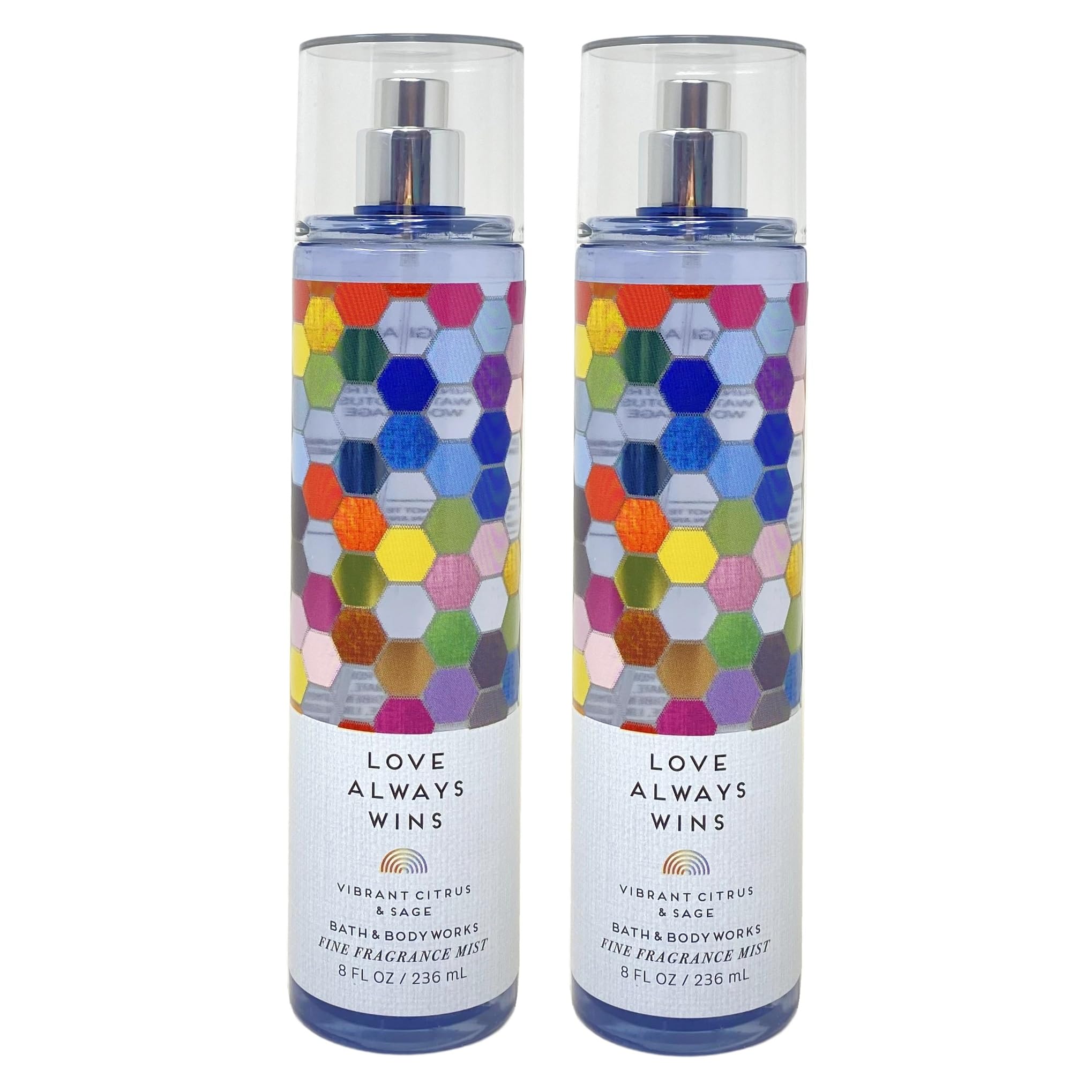 Bath and Body Work LOVE ALWAYS WINS Vibrant Citrus & Sage Fragrance Mist Set. INCLUDES: 2 Fine Fragrance Mists (8 fl oz / 236 mL each). What it smells like: a sparkling celebration of who you are. Fragrance notes: rainbow citrus, water lotus and wood sage. What it does: scents your skin with a mist that's super layerable.