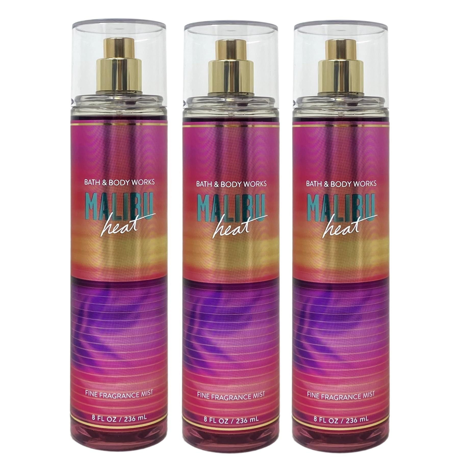 Malibu Heat - What it smells like: the perfect sunny beach day with all your besties. Fragrance notes: juicy pineapple, California orange, coconut flower, creamy coconut milk and sunny musk. 3 Fine Fragrance Mist (8 fl oz / 236 mL each) - What it does: scents your skin with a mist that's super layerable. Bath and Body Work Malibu Heat 3 Pack Fine Fragrance Mist Bundle.