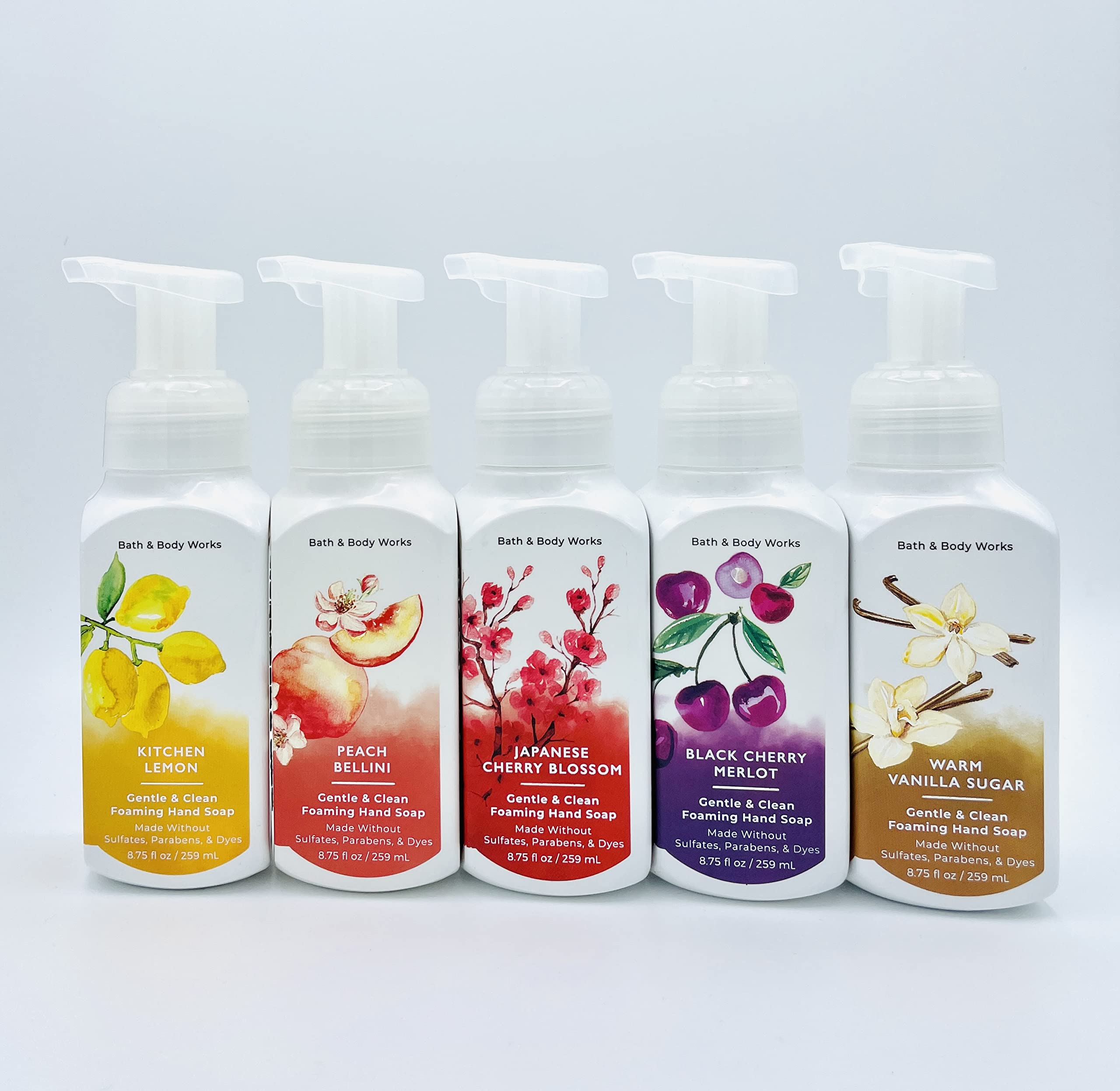 Bath Body Works Gentle Clean Foaming Hand Soap is formulated with nourishing Vitamin E and softening shea extract, and made without dyes, parabens or sulfates to keep your skin happy! This set includes Kitchen Lemon, Peach Bellini, Japanese Cherry Blossom, Black Cherry Merlot, and Warm Vanilla Sugar.
