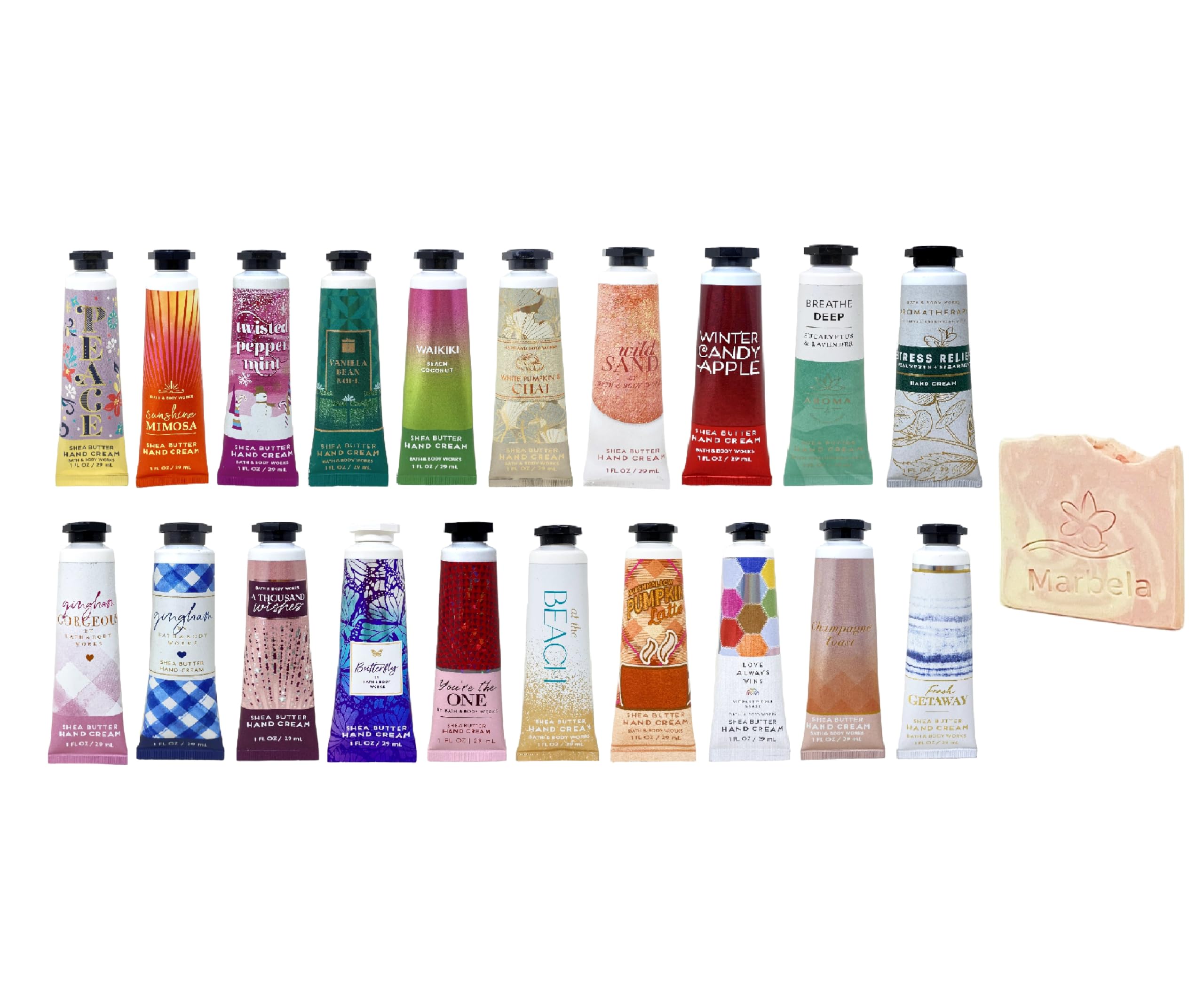 May Receive Hand Creams Not Displayed In Images!! May Receive Repeated Scent!!. Marbela Sample Soap - While ordinary soaps dry out your skin, Marbela specializes in all-natural, moisturizing soaps and bath products that will take your self-care routine to the next level. The priority is to create products that are all-natural, vegan, cruelty-free and most importantly, handmade with love. Hand Cream - What it does: leaves your hands feeling soft, smooth and nourished. Why you'll love it: Infused with the good stuff (shea butter and vitamin E). Rich, luxurious texture. Absorbs quickly. Perfect for your bag, center console.or anywhere really. INCLUDES: 3 randomly selected Hand Creams (1 fl oz 29 mL each) and a Marbela Himalayan Salts Springs Sample Soap (Soap May Vary). Bath Body Works Assorted Hand Cream Set with a Marbela Himalayan Salts Springs Sample Soap.