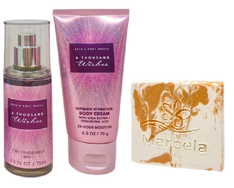 Bath Body Works A Thousand Wishes - Fragrance Mist, Ultimate Hydration Body Cream - with a Peach Gardenia Sample Soap - (Ingredients: Saponified Oils of: Olive Oil, Organic Virgin Coconut Oil, Shea Butter, Castor Oil, Fragrance, Mica, Vitamin E). Travel Size